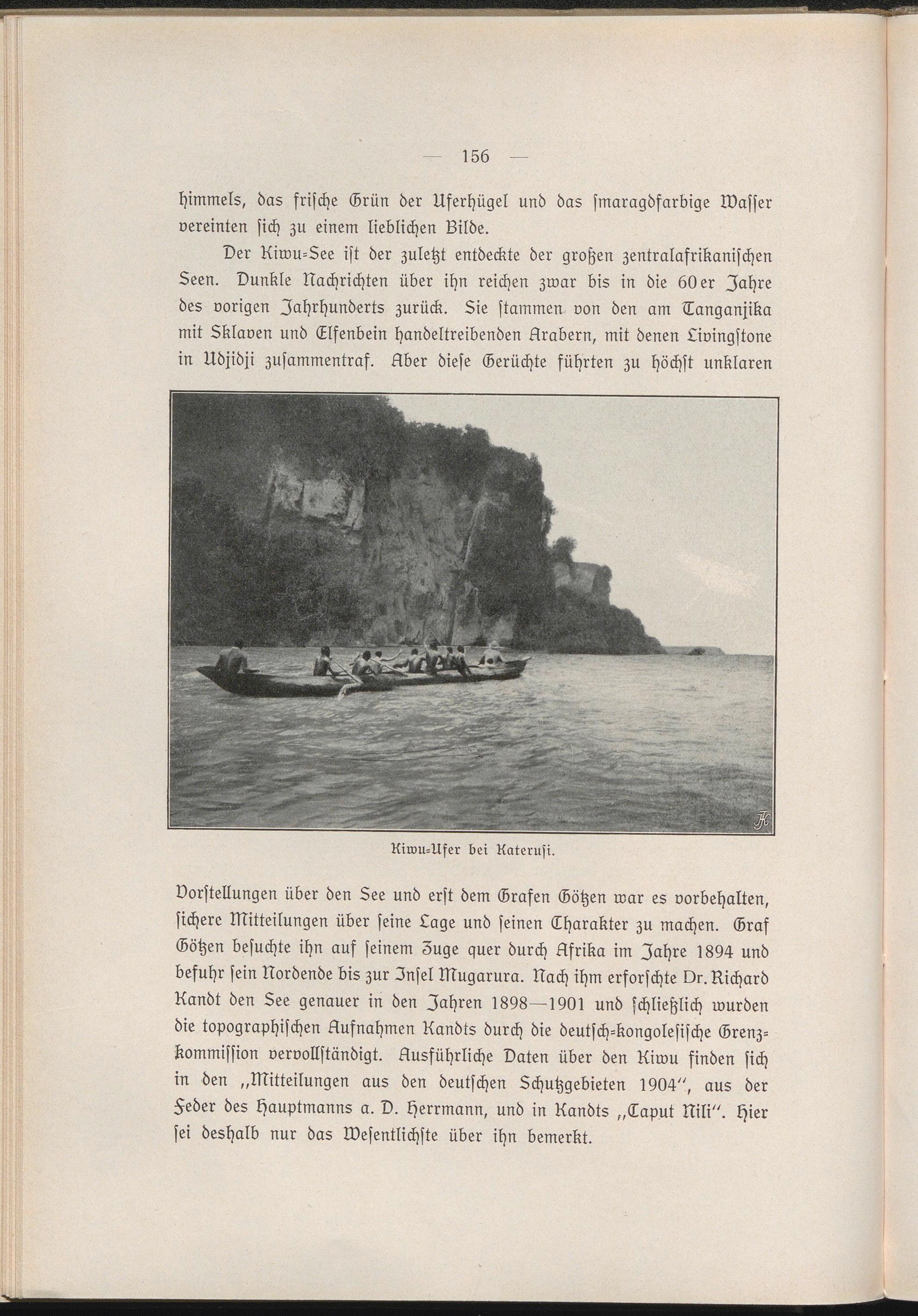 Vorstellungen über den Lee und erst dem Grafen Götzen war es vorbehalten, sichere Nlitteilungen über seine Lage und seinen Tharakter zu machen. Gras Götzen besuchte ihn aus seinem Zuge quer durch Afrika im Jahre 1894 und befuhr sein Nordende bis zur Insel Mugarura. Nach ihm erforschte Dr. Richard Nandt den See genauer in den Jahren 1898—1901 und schließlich wurden die topographischen Nufnahmen Nandts durch die deutsch-kongolesische Grenz- Kommission vervollständigt. Ausführliche Daten über den Niwu finden sich in den „Mitteilungen aus den deutschen Schutzgebieten 1904", aus der Zeder des Hauptmanns a. v. Herrmann, und in Nandts „Laput Nili". hier sei deshalb nur das Wesentlichste über ihn bemerkt.
