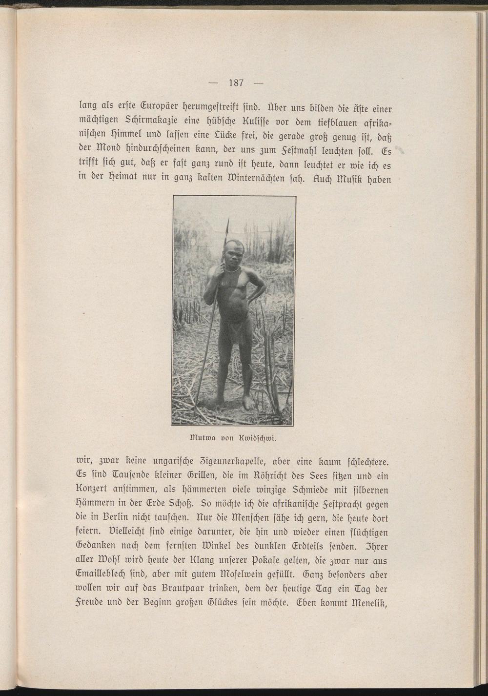 wir, zwar keine ungarische Zigeunerkapelle, aber eine kaum schlechtere. Es sind Tausende kleiner Grillen, die im Röhricht des Sees sitzen und ein Konzert anstimmen, als hämmerten viele winzige Schmiede mit silbernen hämmern in der Erde Schoß. So möchte ich die afrikanische Festpracht gegen die in Berlin nicht tauschen. Nur die Menschen sähe ich gern, die heute dort feiern, vielleicht sind einige darunter, die hin und wieder einen flüchtigen Gedanken nach dem fernsten Winkel des dunklen Erdteils senden. Ihrer aller Wohl wird heute der Klang unserer Pokale gelten, die zwar nur aus Lmailleblech sind, aber mit gutem Moselwein gefüllt. Ganz besonders aber wollen wir auf das Brautpaar trinken, dem der heutige Tag ein Tag der Freude und der Beginn großen Glückes sein möchte. Eben kommt Menelik,