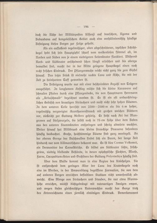 Die Besteigung wurde nur mit einer beschränkten Anzahl von Trägern ausgeführt. In langsamem Anstieg mühte sich die kleine Karawane aus schmalen Pfaden durch eine Pflanzendecke, die von Hauptmann Herrmann als „Urbuschwald" bezeichnet worden ist. Es ist ein oft undurchdringliches Gebüsch von krautigen Sträuchern und meist nicht sehr hohen Bäumen. In dem unteren Teile herrscht von 2300—2500 m ein bis 6 m hoher, regelmäßig verzweigter Acanthaceenstrauch mit großen weichen Blättern vor, vielleicht zur Gattung tVlellera gehörig. Er steht nach Art der Man- groven auf Stelzwurzeln, die selbst noch in 75 cm Höhe über dem Boden aus den unteren Stammknoten entspringen und schräg abwärts wachsen. Weiter hinauf hat Mildbraed eine kleine strauchige Oracaena besonders häufig beobachtet. Große, hochstämmige Bäume sind ganz vereinzelt. An der oberen Grenze des Buschwaldes findet sich ein Baum, der lange Zeit hindurch nur vom Kilimandscharo bekannt war. Ls ist dies Lornus Vvlkensii, ein verwandter der Lornelkirsche. Er bildet am Südkrater lichte, frischgrüne, niedrig bleibende Bestände, in denen epiphytische Flechten, Moose, Farne, Lycopodium-Arten und Orchideen der Gattung pol^stack^a häufig sind.