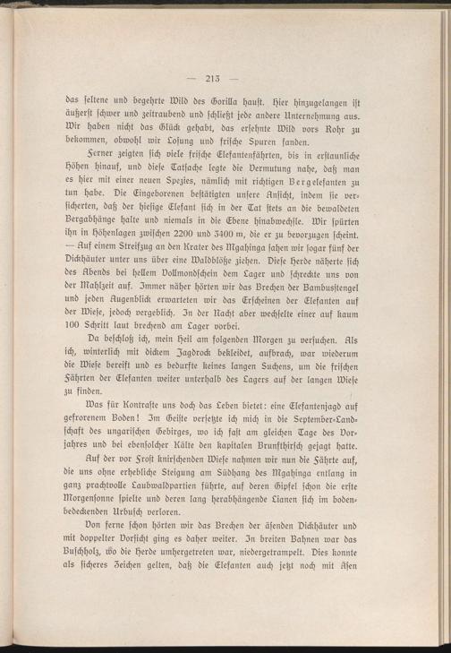 das seltene und begehrte Mld des Gorilla haust. Hier hinzugelangen ist äußerst schwer und zeitraubend und schließt jede andere Unternehmung aus. Wir haben nicht das Glück gehabt, das ersehnte Wild vors Uohr zu bekommen, obwohl wir Losung und frische Spuren fanden.