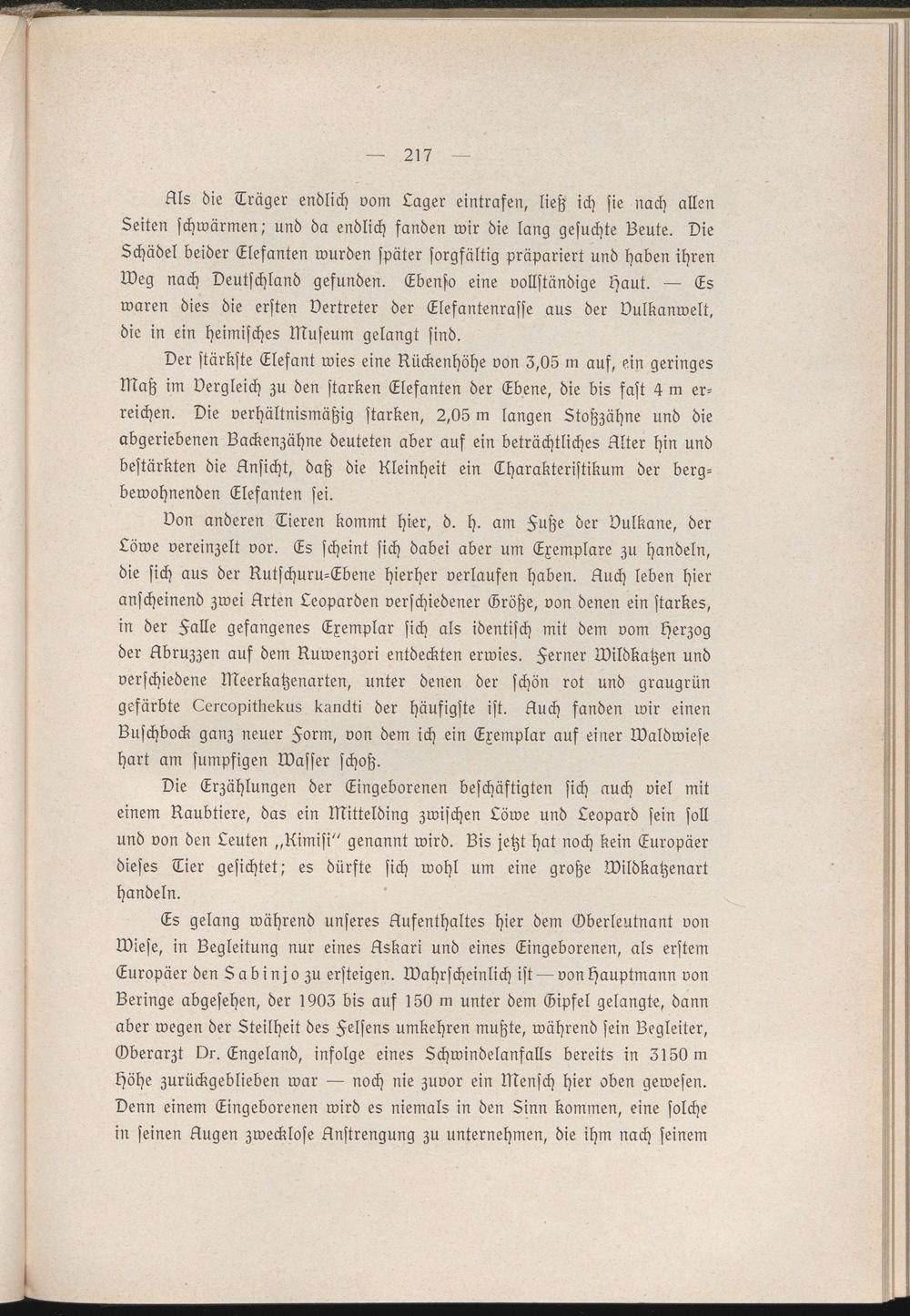 Als die Träger endlich vom Lager eintrafen, ließ ich sie nach allen Leiten schwärmen,- und da endlich fanden wir die lang gesuchte Leute. Die Lchädel beider Elefanten wurden später sorgfältig präpariert und haben ihren Weg nach Deutschland gefunden. Ebenso eine vollständige haut. — Es waren dies die ersten Vertreter der Elefantenrasse aus der Vulkanwelt, die in ein heimisches Museum gelangt sind.