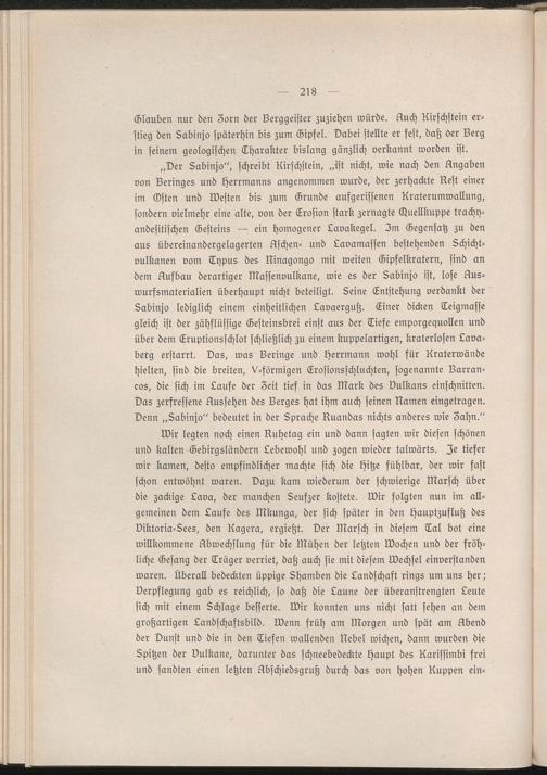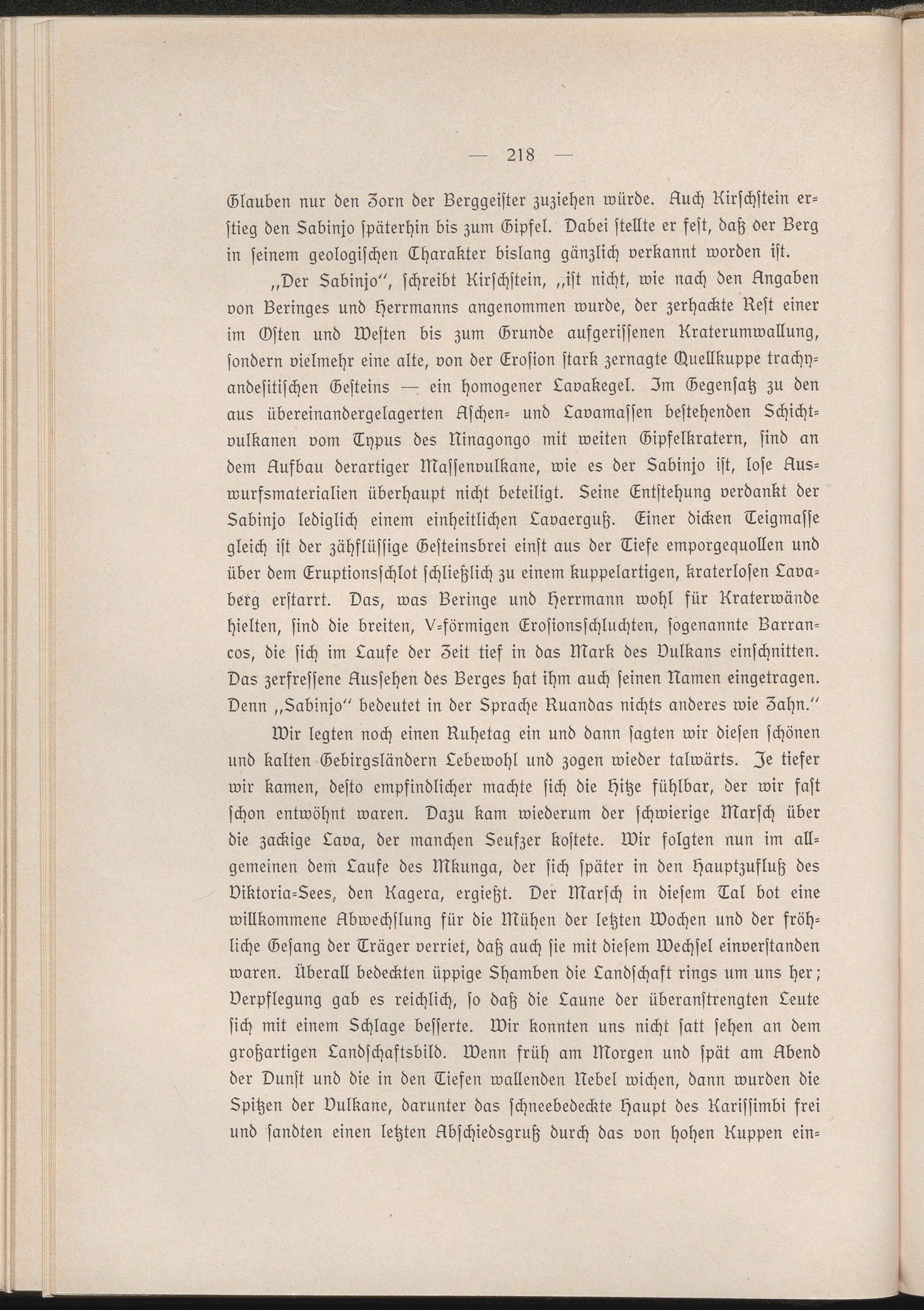 Wir legten noch einen Buhetag ein und dann sagten wir diesen schönen und kalten Gebirgsländern Lebewohl und zogen wieder talwärts. Je tiefer wir kamen, desto empfindlicher machte sich die Hitze fühlbar, der wir fast schon entwöhnt waren. Dazu kam wiederum der schwierige Marsch über die zackige Lava, der manchen Leufzer kostete. Wir folgten nun im allgemeinen dem Lause des Mkunga, der sich später in den Hauptzufluß des Viktoria-Lees, den Bagera, ergießt. Der Marsch in diesem Tal bot eine willkommene Abwechslung für die Mühen der letzten Wochen und der fröhliche Gesang der Träger verriet, daß auch sie mit diesem Wechsel einverstanden waren. Überall bedeckten üppige Lhamben die Landschaft rings um uns her,' Verpflegung gab es reichlich, so daß die Laune der überanstrengten Leute sich mit einem Lchlage besserte. Wir konnten uns nicht satt sehen an dem großartigen Landschaftsbild. Wenn früh am Morgen und spät am Abend der Dunst und die in den Tiefen wallenden Nebel wichen, dann wurden die Spitzen der Vulkane, darunter das schneebedeckte Haupt des Barissimbi frei und sandten einen letzten Abschiedsgruß durch das von hohen Buppen ein-