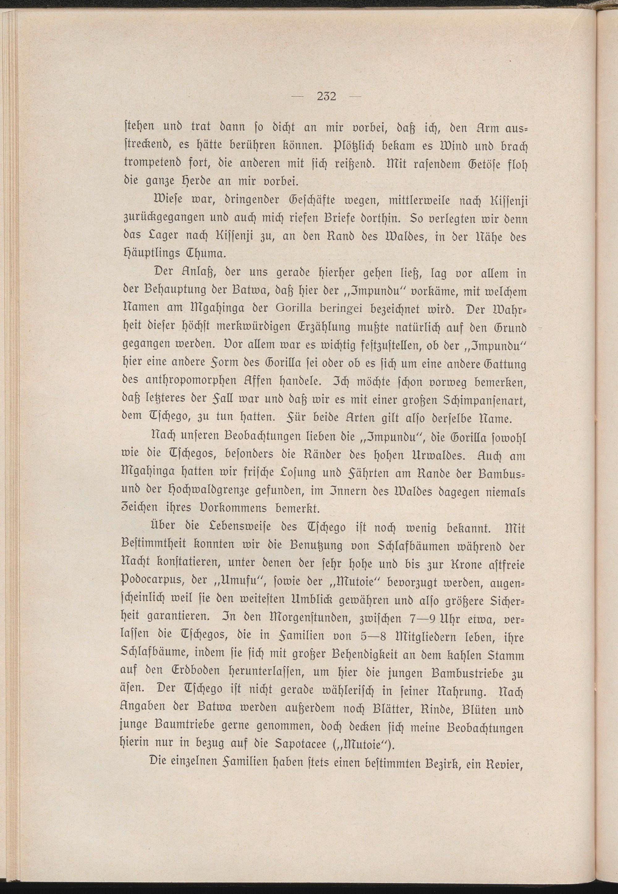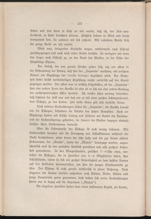 Der Anlaß, der uns gerade hierher gehen ließ, lag vor allem in der Behauptung der Batwa, daß hier der „Impundu" vorkäme, mit welchem Namen am Mgahinga der Qorilla berin§ei bezeichnet wird. Der Wahrheit dieser höchst merkwürdigen Erzählung mußte natürlich auf den Grund gegangen werden, vor allem war es wichtig festzustellen, ob der „Impundu" hier eine andere Form des Gorilla sei oder ob es sich um eine andere Gattung des anthropomorphen Affen handele. Ich möchte schon vorweg bemerken, daß letzteres der Hall war und daß wir es mit einer großen Zchimpansenart, dem Tschego, zu tun hatten. Für beide Arten gilt also derselbe Name.