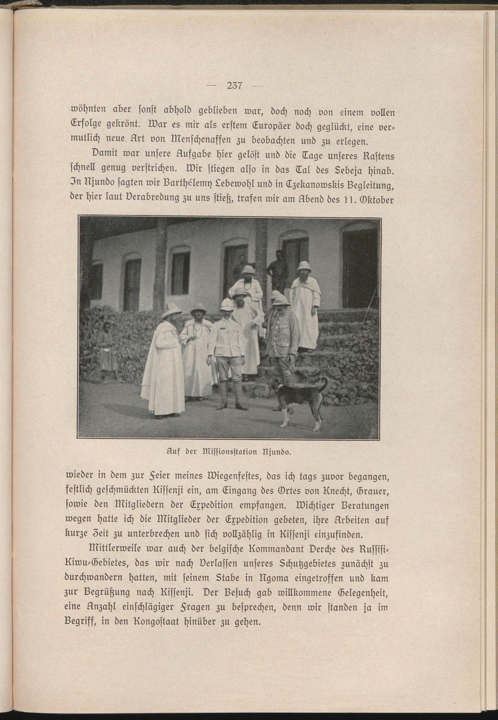 wieder in dem zur Heier meines Wiegenfestes, das ich tags zuvor begangen, festlich geschmückten Kissenji ein, am Eingang des Grtes von Knecht, Grauer, sowie den Mitgliedern der Expedition empfangen. Wichtiger Beratungen wegen hatte ich die Mitglieder der Expedition gebeten, ihre Arbeiten aus kurze Zeit zu unterbrechen und sich vollzählig in liissenji einzusinden.