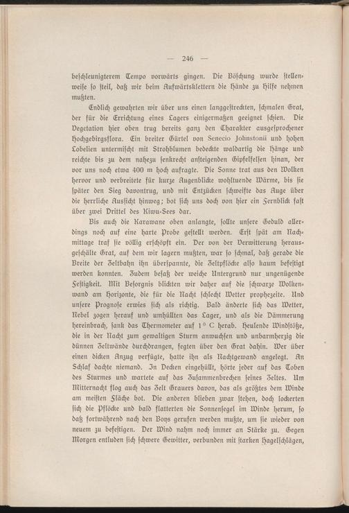 Endlich gewahrten wir über uns einen langgestreckten, schmalen Grat, der für die Errichtung eines Lagers einigermaßen geeignet schien. Die Vegetation hier oben trug bereits ganz den Lharakter ausgesprochener Hochgebirgsflora. Ein breiter Gürtel von Senecio joknstonii und hohen Lobelien untermischt mit Strohblumen bedeckte waldartig die Hänge und reichte bis zu dem nahezu senkrecht ansteigenden Gipfelfelsen hinan, der vor uns noch etwa 400 m hoch aufragte. Die Sonne trat aus den Wolken hervor und verbreitete für kurze Augenblicke wohltuende Wärme, bis sie später den Sieg davontrug, und mit Entzücken schweifte das Auge über die herrliche Aussicht hinweg,- bot sich uns doch von hier ein Fernblick fast über zwei Drittel des Uiwu-Sees dar.