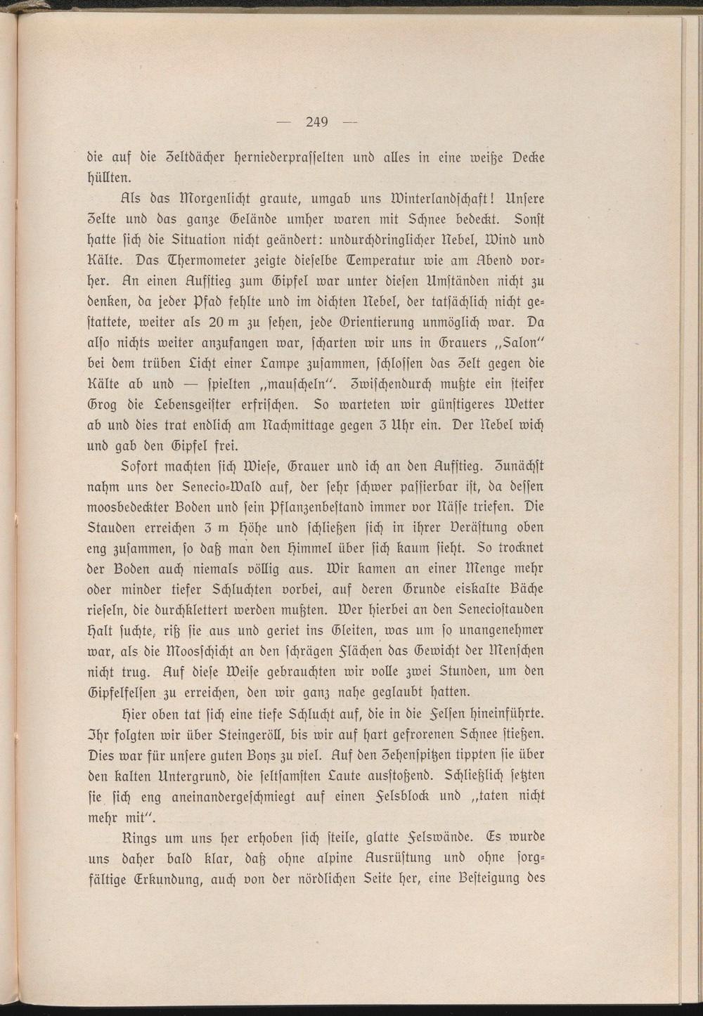Als das Morgenlicht graute, umgab uns Winterlandschaft! Unsere Zelte und das ganze Gelände umher waren mit Zchnee bedeckt. Sonst hatte sich die Situation nicht geändert: undurchdringlicher Uebel, Wind und Kälte. Das Thermometer zeigte dieselbe Temperatur wie am Übend vorher. An einen Aufstieg zum Gipfel war unter diesen Umständen nicht zu denken, da jeder Pfad fehlte und im dichten Uebel, der tatsächlich nicht gestattete, weiter als 20 m zu sehen, jede Orientierung unmöglich war. Da also nichts weiter anzufangen war, scharten wir uns in Grauers „Salon" bei dem trüben Sicht einer Lampe zusammen, schlössen das Zelt gegen die Kälte ab und — spielten „mauscheln". Zwischendurch mußte ein steifer Grog die Lebensgeister erfrischen. So warteten wir günstigeres Wetter ab und dies trat endlich am Nachmittage gegen 3 Uhr ein. Der Nebel wich und gab den Gipfel frei.