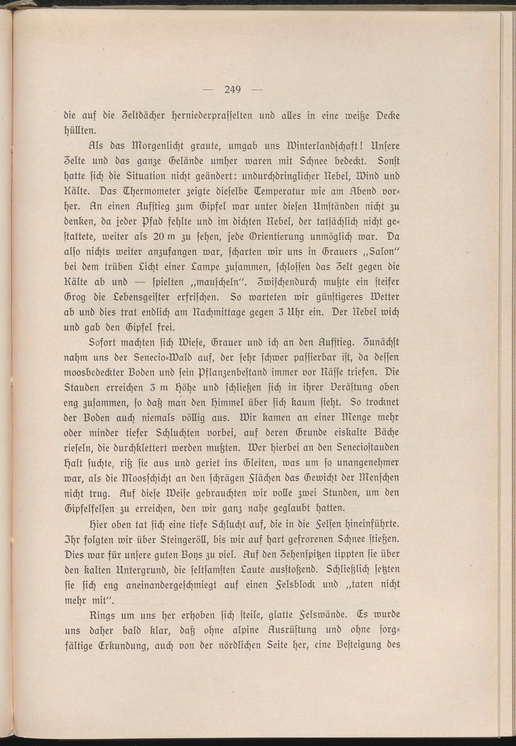 Sofort machten sich Wiese, Grauer und ich an den Ausstieg. Zunächst nahm uns der Senecio-Wald auf, der sehr schwer passierbar ist, da dessen moosbedeckter Loden und sein pflanzenbestand immer vor Nässe triefen. Die Stauden erreichen 3 m höhe und schließen sich in ihrer verästung oben eng zusammen, so daß man den Himmel über sich kaum sieht. So trocknet der Boden auch niemals völlig aus. Wir kamen an einer Menge mehr oder minder tiefer Schluchten vorbei, aus deren Grunde eiskalte Bäche rieseln, die durchklettert werden mußten. Wer hierbei an den Seneciostauden halt suchte, riß sie aus und geriet ins Gleiten, was um so unangenehmer war, als die Moosschicht an den schrägen Flächen das Gewicht der Menschen nicht trug. Auf diese Weise gebrauchten wir volle zwei Stunden, um den Gipfelfelsen zu erreichen, den wir ganz nahe geglaubt hatten.