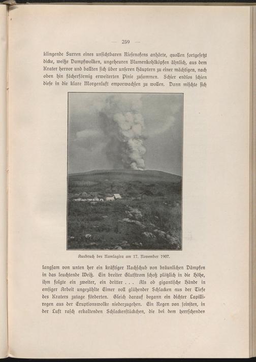 Klingende Surren eines unsichtbaren Riesenofens anhörte, quollen fortgesetzt dicke, weiße vampfwolken, ungeheuren Blumenkohlköpfen ähnlich, aus dem Krater hervor und ballten sich über unseren Häuptern zu einer mächtigen, nach oben hin fächerförmig erweiterten Pinie zusammen. Schier endlos schien diese in die klare Morgenluft emporwachsen zu wollen. Dann mischte sich