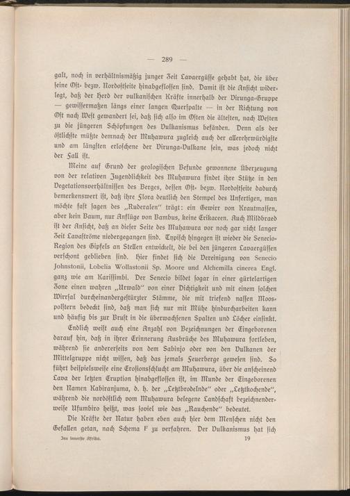 galt, noch in verhältnismäßig junger Zeit Lavaergüsse gehabt hat, die über seine Ost- bezw. Nordostseite hinabgeflossen sind. Damit ist die Unsicht wider- legt, daß der Herd der vulkanischen Kräfte innerhalb der Virunga-Gruppe — gewissermaßen längs einer langen Ouerspalte — in der Richtung von Ost nach West gewandert sei, daß sich also im Osten die ältesten, nach Westen zu die jüngeren Schöpfungen des Vulkanismus befänden. Denn als der östlichste müßte demnach der Muhawura zugleich auch der allerehrwürdigste und am längsten erloschene der virunga-vulkane sein, was jedoch nicht der Fall ist.