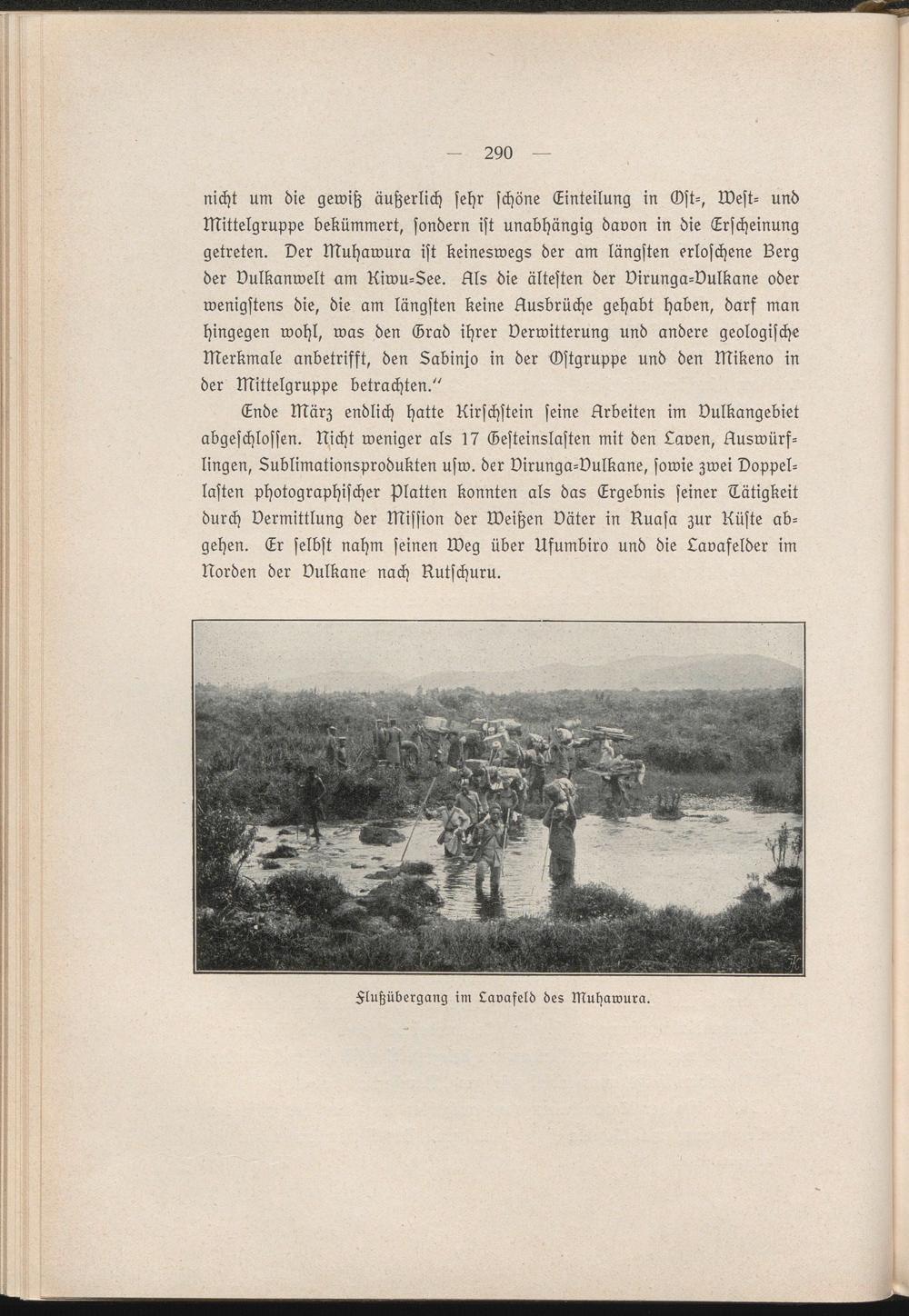 Ende März endlich hatte Nirschstein seine Arbeiten im Vulkangebiet abgeschlossen. Nicht weniger als 17 Gesteinslasten mit den Laven, Auswürflingen, Lublimationsprodukten usw. der virunga-vulkane, sowie zwei Doppel- lasten photographischer Platten konnten als das Ergebnis seiner Tätigkeit durch Vermittlung der Mission der Weißen väter in Nuasa zur Nüste abgehen. Lr selbst nahm seinen Weg über Ufumbiro und die Lavaselder im Norden der Vulkane nach Nutschuru.