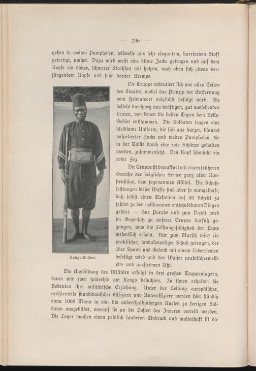 Die Ausbildung des Militärs erfolgt in drei großen Truppenlagern, deren wir zwei späterhin am Kongo besuchten. In ihnen erhalten die Rekruten ihre militärische Erziehung. Unter der Leitung europäischer, größtenteils skandinavischer Offiziere und Unteroffiziere werden hier ständig etwa lOOO Mann in ein- bis anderthalbjährigen Kursen zu fertigen Soldaten ausgebildet, worauf sie an die Posten des Inneren verteilt werden. Die Lager machen einen peinlich sauberen Eindruck und musterhaft ist die