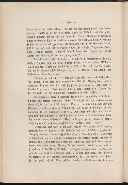 Am folgenden Morgen zeichnete sich von der denkwürdigen Stelle der Schlucht aus wieder eine ganz frische Löwenfährte in dem triefend nassen Grase ab, der wir natürlich folgten. Nach drei Stunden sichteten wir den flüchtigen Burschen auf über 200 Schritt. Im hohen Grase hatte ich nur momentweise den mächtigen Ropf frei. Ich zielte und zielte und konnte kein Ankommen finden, so schnell tauchte er immer wieder im Grase unter, sich immer weiter entfernend. Als er mir ganz zu verschwinden drohte, schoß ich endlich, auf einen Zufallstreffer hoffend, und — fehlte!