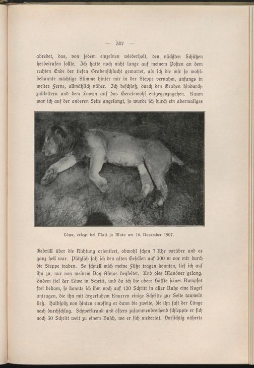 Gebrüll über die Richtung orientiert, obwohl schon 7 Uhr vorüber und es ganz hell war. plötzlich sah ich den alten Gesellen auf 300 m vor mir durch die Steppe traben. So schnell mich meine Füße tragen konnten, lief ich auf ihn zu, nur von meinem Boy Ulmas begleitet. Und dies Manöver gelang. Zudem fiel der Löwe in Schritt, und da ich die obere Hälfte seines Rumpfes frei bekam, so konnte ich ihm noch aus 120 Schritt in aller Ruhe eine Kugel antragen, die ihn mit ärgerlichem Knurren einige Schritte zur Seite taumeln ließ. Halbspitz von hinten empfing er dann die zweite, die ihn fast der Länge nach durchschlug. Schwerkrank und öfters zusammenbrechend schleppte er sich noch 30 Schritt weit zu einem Busch, wo er sich niedertat. Vorsichtig näherte