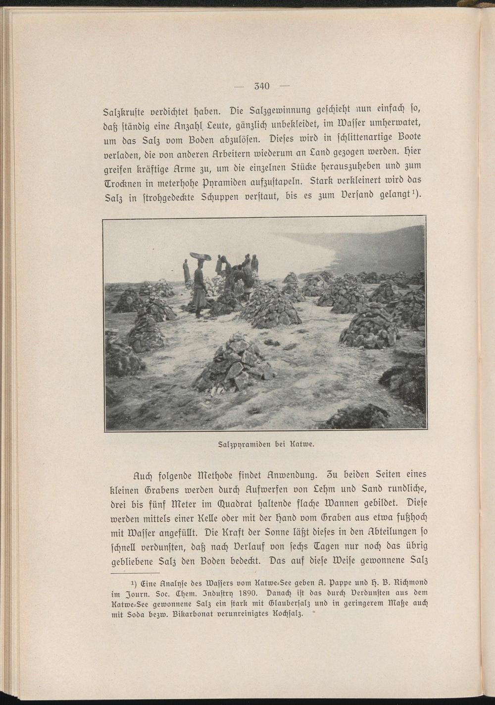 Auch folgende Methode findet Anwendung. Zu beiden Seiten eines kleinen Grabens werden durch Auswerfen von Lehm und Sand rundliche, drei bis fünf Meter im Csuadrat haltende flache Wannen gebildet. Diese werden mittels einer Kelle oder mit der Hand vom Graben aus etwa fußhoch mit Wasser angefüllt. Die Kraft der Sonne läßt dieses in den Abteilungen so schnell verdunsten, daß nach Verlauf von sechs Tagen nur noch das übrig gebliebene Salz den Boden bedeckt. Das aus diese Weise gewonnene Salz