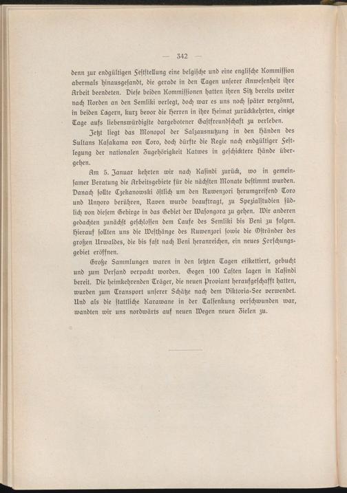 denn zur endgültigen Feststellung eine belgische und eine englische Kommission abermals hinausgesandt, die gerade in den Tagen unserer Anwesenheit ihre Arbeit beendeten. Diese beiden Kommissionen hatten ihren Sitz bereits weiter nach Norden an den Semliki verlegt, doch war es uns noch später vergönnt, in beiden Lagern, kurz bevor die Herren in ihre Heimat zurückkehrten, einige Tage aufs liebenswürdigste dargebotener Gastfreundschaft zu verleben.