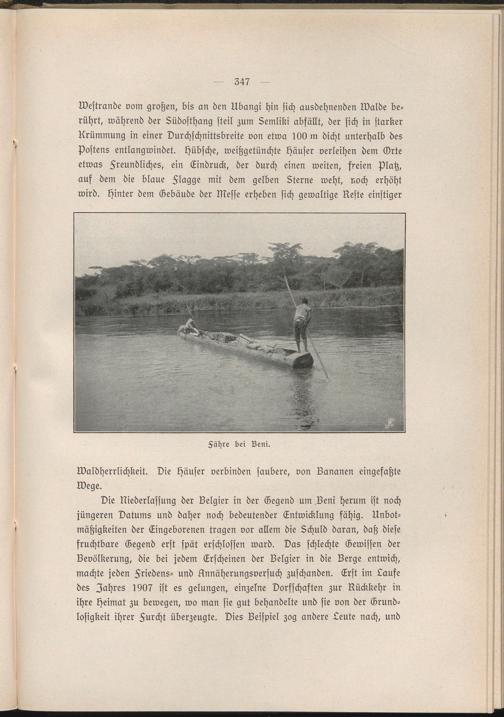 Die Niederlassung der Belgier in der Gegend um Beni herum ist noch jüngeren Datums und daher noch bedeutender Entwicklung fähig. Unbot- mäßigkeiten der Eingeborenen tragen vor allem die Schuld daran, daß diese fruchtbare Gegend erst spät erschlossen ward. Das schlechte Gewissen der Bevölkerung, die bei jedem Erscheinen der Belgier in die Berge entwich, machte jeden Friedens- und Annäherungsversuch zuschanden. Erst im Lause des Jahres l907 ist es gelungen, einzelne Dorfschaften zur Rückkehr in ihre Heimat zu bewegen, wo man sie gut behandelte und sie von der Grundlosigkeit ihrer Furcht überzeugte. Dies Beispiel zog andere Leute nach, und