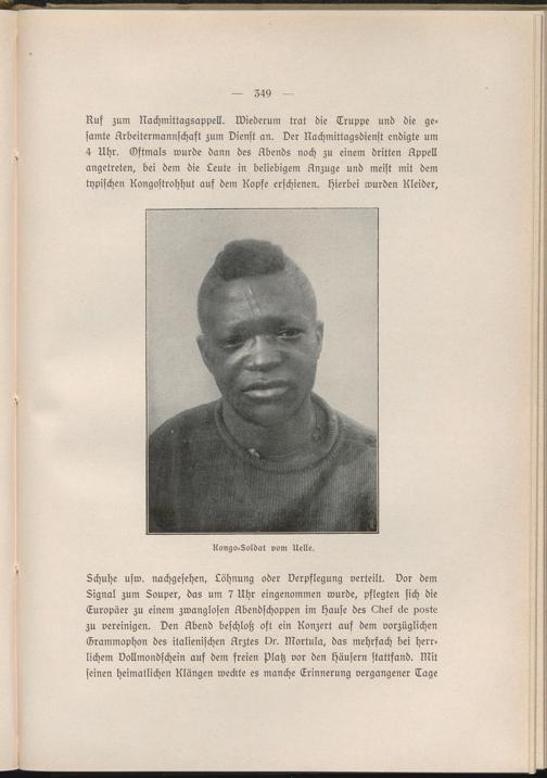 Ruf zum Nachmittagsappell. Wiederum trat die Truppe und die gesamte Nrbeitermannschaft zum Dienst an. Der Nachmittagsdienst endigte um 4 Uhr. Oftmals wurde dann des Nbends noch zu einem dritten Nppell angetreten, bei dem die Leute in beliebigem Nnzuge und meist mit dem typischen Kongostrohhut auf dem Kopfe erschienen. Hierbei wurden Kleider,