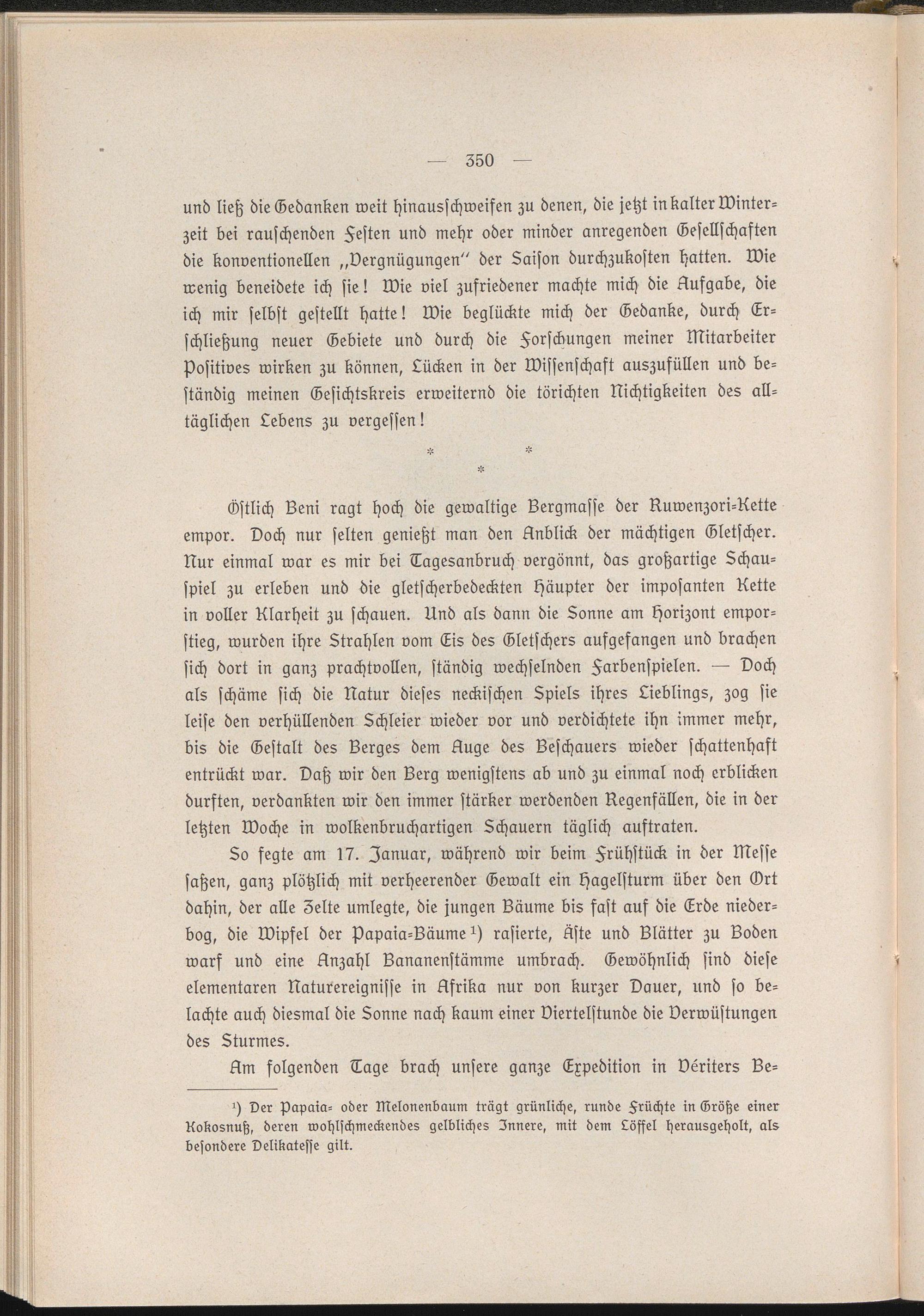 und ließ die Gedanken weit Hinausschweifen zu denen, die jetzt in kalter Winterzeit bei rauschenden Festen und mehr oder minder anregenden Gesellschaften die konventionellen „Vergnügungen" der Saison durchzukosten hatten. Wie wenig beneidete ich sie! Wie viel zufriedener machte mich die Aufgabe, die ich mir selbst gestellt hatte! Wie beglückte mich der Gedanke, durch Erschließung neuer Gebiete und durch die Forschungen meiner Mitarbeiter positives wirken zu können, Lücken in der Wissenschaft auszufüllen und beständig meinen Gesichtskreis erweiternd die törichten Nichtigkeiten des alltäglichen Lebens zu vergessen!