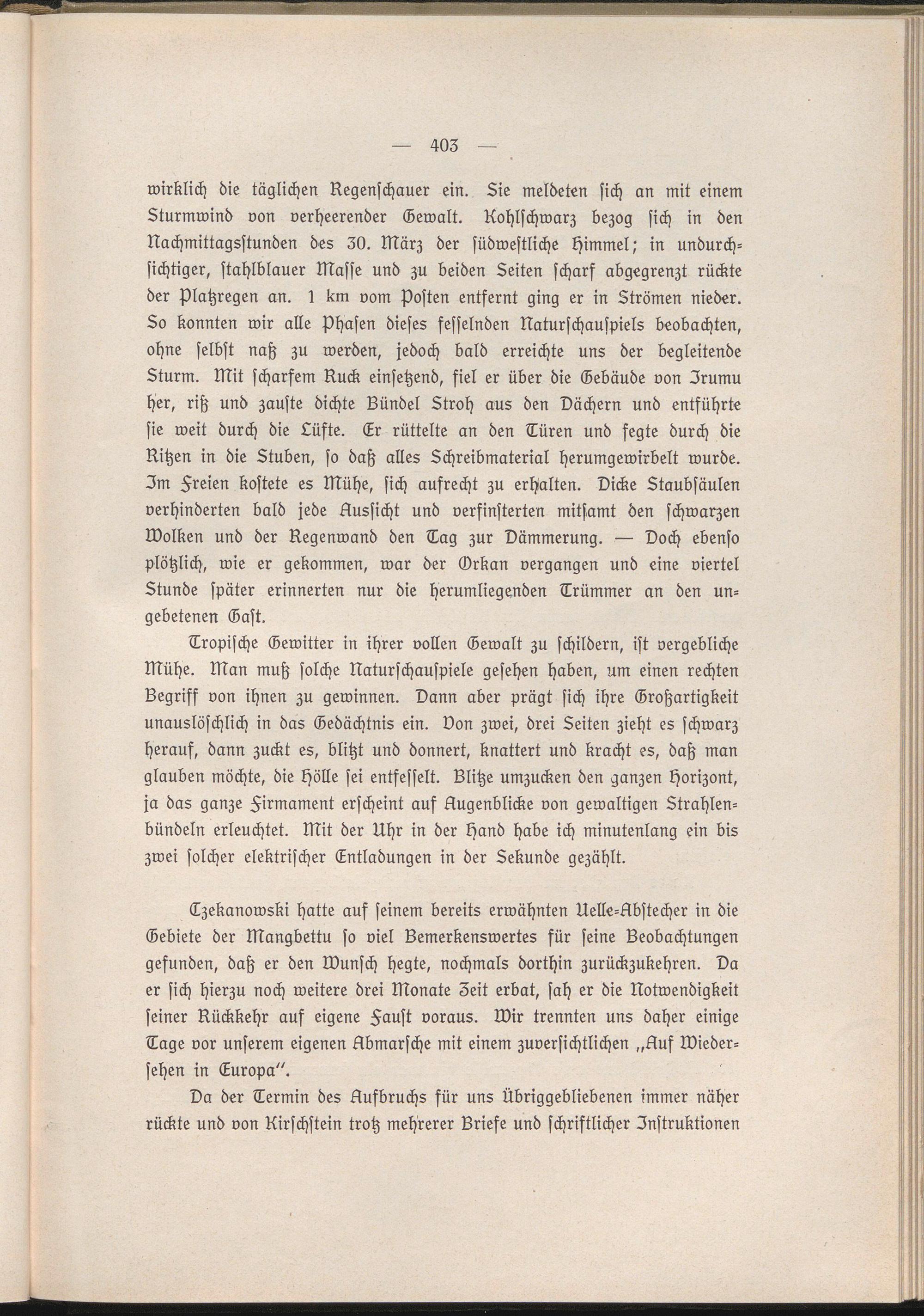 Tzekanowski hatte auf seinem bereits erwähnten Uelle-Rbstecher in die Gebiete der Mangbettu so viel Bemerkenswertes für seine Beobachtungen gesunden, daß er den Wunsch hegte, nochmals dorthin zurückzukehren. Da er sich hierzu noch weitere drei Monate Zeit erbat, sah er die Notwendigkeit seiner Rückkehr aus eigene Faust voraus. Wir trennten uns daher einige Tage vor unserem eigenen Abmärsche mit einem zuversichtlichen „Auf Wiedersehen in Europa".