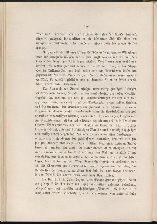 Auch uns ist eine Ahnung solchen Gefühles aufgegangen. — Wir gingen zwar auf gebahnten Wegen, wir wußten längst voraus, wo wir an jedem Tage unser Haupt zur Ruhe legen würden, Verpflegung war wohl vorbereitet, wir reisten hier viel bequemer als oft im Anfang in der Steppe oder im Vulkangebiet, und doch haben wir das Bedrückende dieses ungeheuren Waldes empfinden gelernt,' nur die Reisebedingungen waren andere, der Wald ist derselbe geblieben wie zu Stanleys Zeiten in seiner unendlichen, unerbittlichen Einsamkeit.