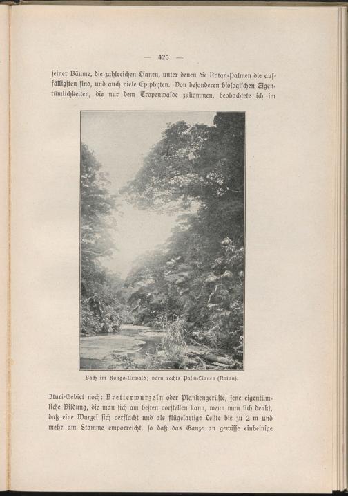 Ituri-Gebiet noch: Bretterwurzeln oder plankengerüste, jene eigentümliche Bildung, die man sich am besten vorstellen kann, wenn man sich denkt, daß eine Wurzel sich verflacht und als flügelartige Leiste bis zu 2 m und mehr am Ztamme emporreicht, so daß das Ganze an gewisse einbeinige