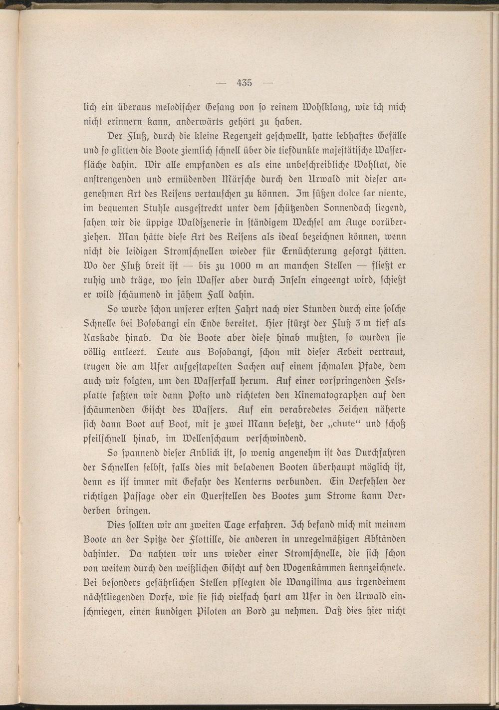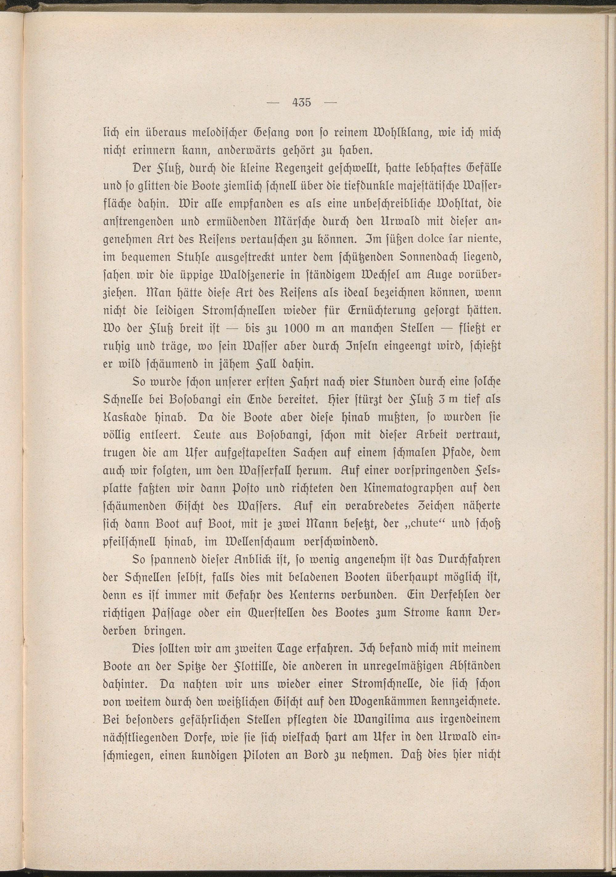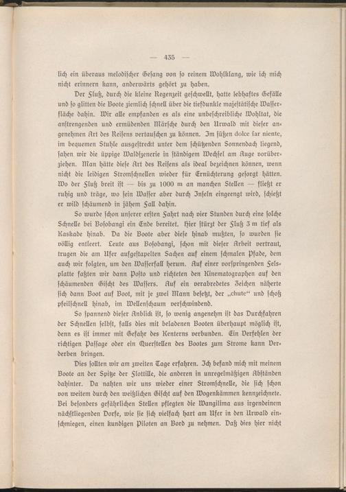 Dies sollten wir am zweiten Tage erfahren. Ich befand mich mit meinem Boote an der Spitze der Flottille, die anderen in unregelmäßigen Rbständen dahinter. Da nahten wir uns wieder einer Stromschnelle, die sich schon von weitem durch den weißlichen Gischt aus den Wogenkämmen kennzeichnete. Lei besonders gefährlichen Stellen pflegten die Wangilima aus irgendeinem Nächstliegenden Dorfe, wie sie sich vielfach hart am Ufer in den Urwald ein- schmiegen, einen kundigen Piloten an Bord zu nehmen. Daß dies hier nicht