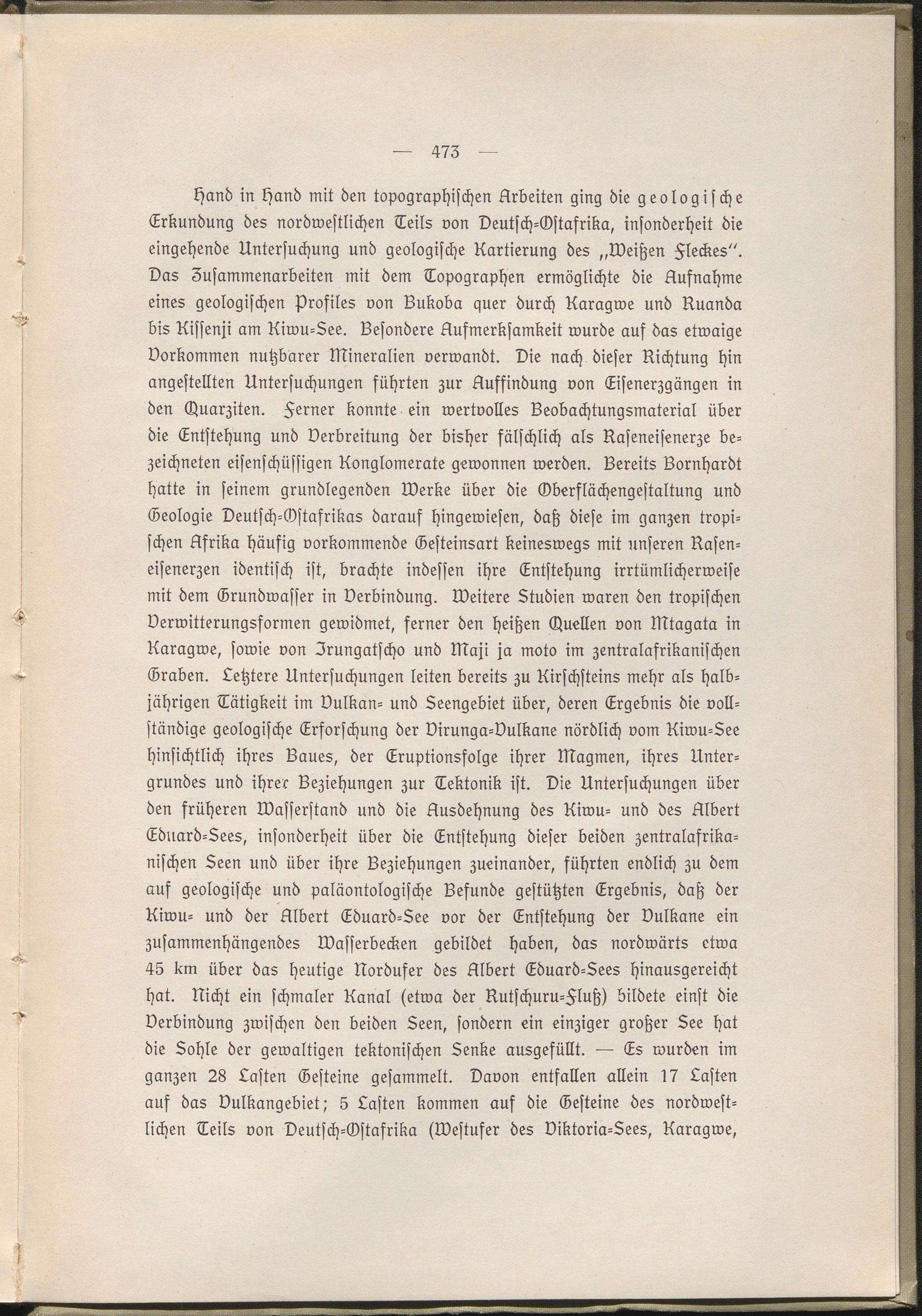 Hand in Hand mit den topographischen Arbeiten ging die geologische Erkundung des nordwestlichen Teils von Veutsch-Dstafrika, insonderheit die eingehende Untersuchung und geologische Rartierung des „Weißen Fleckes". Das Zusammenarbeiten mit dem Topographen ermöglichte die Aufnahme eines geologischen Profiles von Bukoba quer durch Raragwe und Uuanda bis Rissenji am Riwu-Lee. Besondere Aufmerksamkeit wurde auf das etwaige vorkommen nutzbarer Mineralien verwandt. Die nach dieser Richtung hin angestellten Untersuchungen führten zur Auffindung von Lisenerzgängen in den (Huarziten. Ferner konnte ein wertvolles Beobachtungsmaterial über die Entstehung und Verbreitung der bisher fälschlich als Uaseneisenerze bezeichneten eisenschüssigen Konglomerate gewonnen werden. Bereits Bornhardt hatte in seinem grundlegenden Werke über die Dberflächengestaltung und Geologie Deutsch-Gstafrikas darauf hingewiesen, daß diese im ganzen tropischen Afrika häufig vorkommende Gesteinsart keineswegs mit unseren Rasen- eisenerzen identisch ist, brachte indessen ihre Entstehung irrtümlicherweise mit dem Grundwasser in Verbindung. Weitere Ltudien waren den tropischen Verwitterungsformen gewidmet, ferner den heißen Quellen von Mtagata in Raragwe, sowie von Irungatscho und Maji ja moto im zentralafrikanischen Graben. Letztere Untersuchungen leiten bereits zu Rirschsteins mehr als halbjährigen Tätigkeit im Vulkan- und Leengebiet über, deren Ergebnis die vollständige geologische Erforschung der virunga-vulkane nördlich vom Riwu-Lee hinsichtlich ihres Baues, der Eruptionsfolge ihrer Magmen, ihres Untergrundes und ihrer Beziehungen zur Tektonik ist. Die Untersuchungen über den früheren Wasserstand und die Ausdehnung des Riwu- und des Albert Lduard-Lees, insonderheit über die Entstehung dieser beiden zentralafrikanischen Leen und über ihre Beziehungen zueinander, führten endlich zu dem auf geologische und paläontologische Befunde gestützten Ergebnis, daß der Riwu- und der Albert Eduard-Lee vor der Entstehung der Vulkane ein zusammenhängendes Wasserbecken gebildet haben, das nordwärts etwa 45 Km über das heutige Nordufer des Albert Lduard-Lees hinausgereicht hat. Nicht ein schmaler Ranal (etwa der Rutschuru-Fluß) bildete einst die Verbindung zwischen den beiden Leen, sondern ein einziger großer Lee hat die Lohle der gewaltigen tektonischen Lenke ausgefüllt. — Ls wurden im ganzen 28 Lasten Gesteine gesammelt. Davon entfallen allein l7 Lasten auf das Vulkangebiet,- 5 Lasten kommen auf die Gesteine des nordwestlichen Teils von Deutsch-Gstafrika (Westufer des Viktoria-Lees, Raragwe,