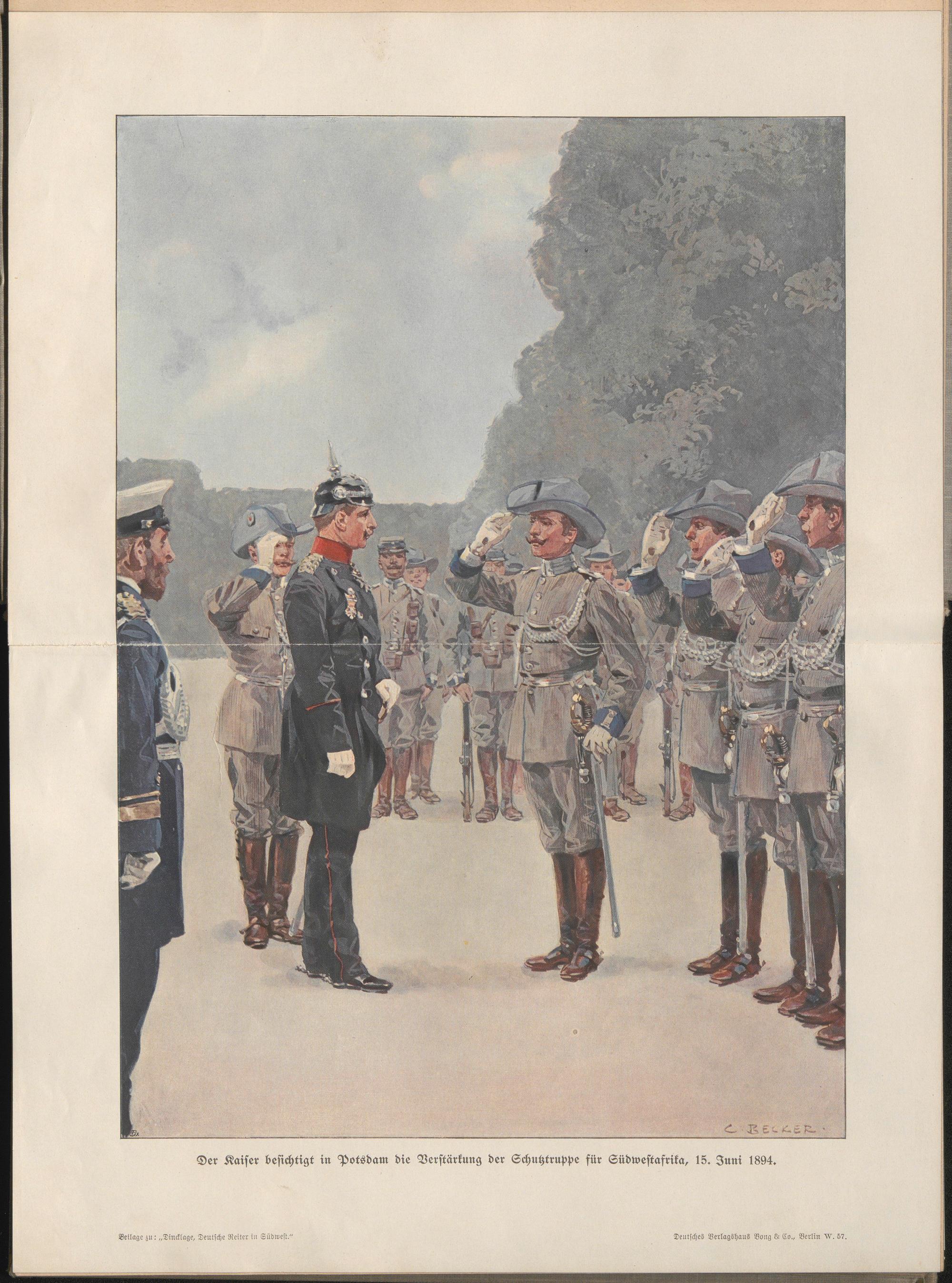 Der Kaiser besichtigt in Potsdam die Verstärkung der Schuhtruppe für Südwestafrika, 15. Juni 1894.