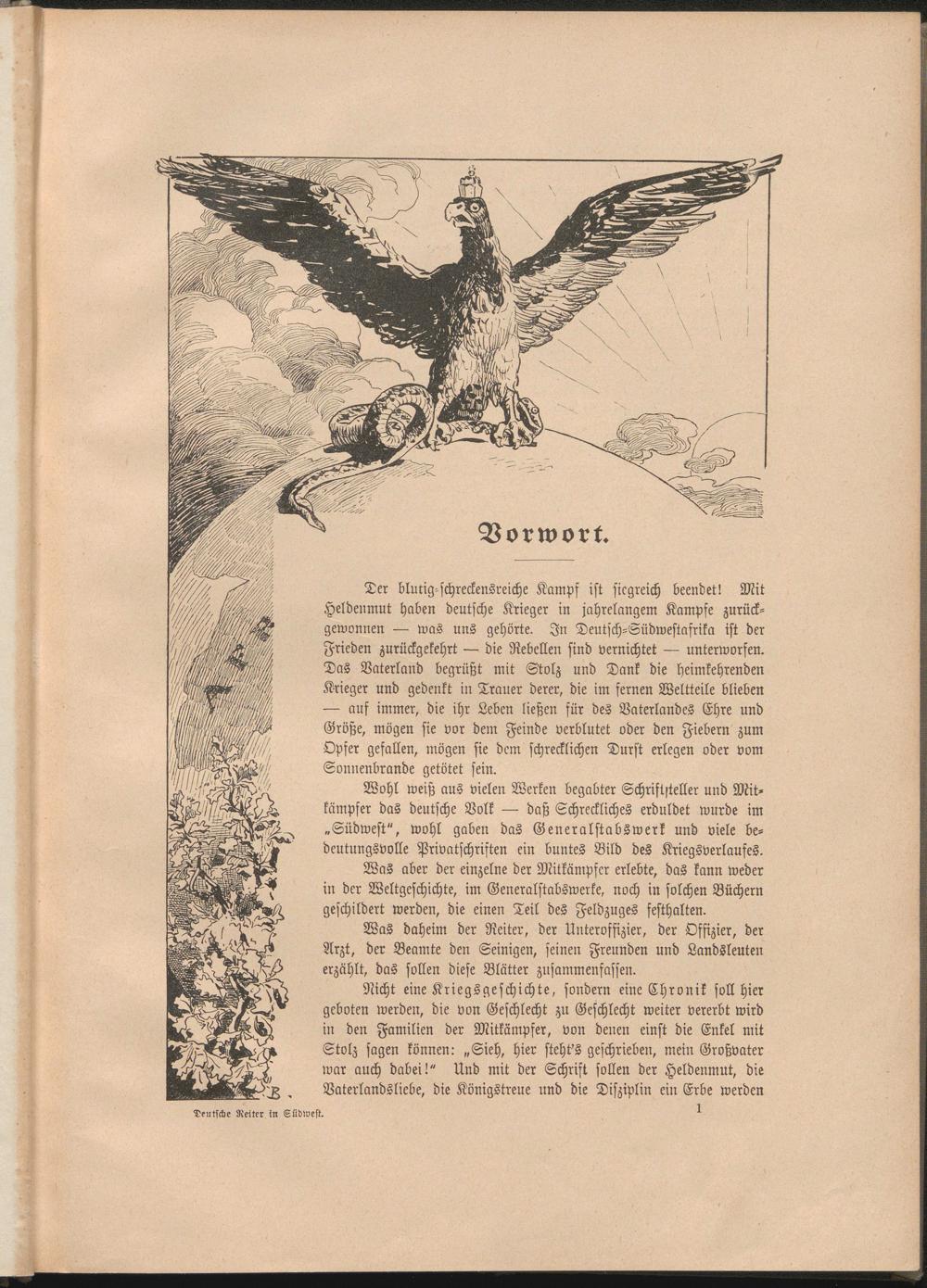 Ter blutig-schreckensreiche Kampf ist siegreich beendet! Mit Heldenmut haben deutsche Krieger in jahrelangem Kampfe zurückgewonnen — was uns gehörte. In Deutsch-Südwestafrika ist der Frieden zurückgekehrt — die Rebellen sind vernichtet — unterworfen. Das Vaterland begrüßt mit Stolz und Dank die heimkehrenden Krieger und gedenkt in Trauer derer, die im fernen Weltteile blieben — auf immer, die ihr Leben ließen für des Vaterlandes Ehre und Größe, mögen sie vor dem Feinde verblutet oder den Fiebern zum Opfer gefallen, mögen sie dem schrecklichen Durst erlegen oder vom Sonnenbrände getötet sein.