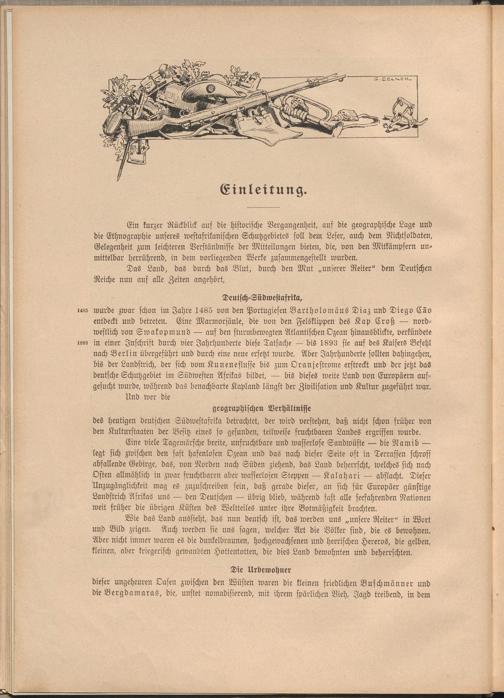 Wie das Land aussieht, das nun deutsch ist, das werden uns „unsere Reiter" in Wort und Bild zeigen. Auch werden sie uns sagen, welcher Art die Völker sind, die es bewohnen. Aber nicht immer waren es die dunkelbraunen, hochgewachsenen und herrischen Hereros, die gelben, kleinen, aber kriegerisch gewandten Hottentotten, die dies Land bewohnten und beherrschten.