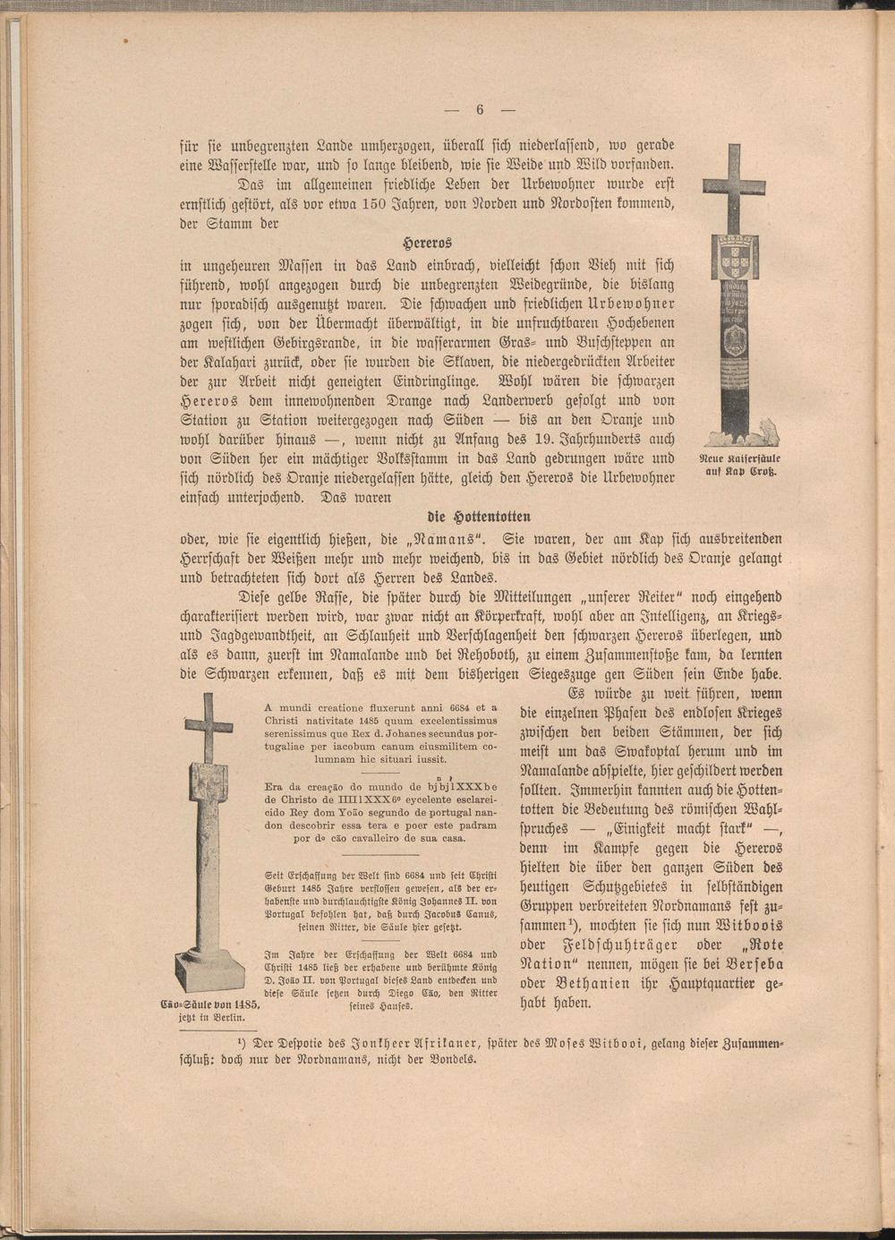 Diese gelbe Rasse, die später durch die Mitteilungen „unserer Reiter" noch eingehend charakterisiert werden wird, war zwar nicht an Körperkraft, wohl aber an Intelligenz, an Kriegsund Jagdgewandtheit, an Schlauheit und Verschlagenheit den schwarzen Hereros überlegen, und als es dann, zuerst im Namalande und bei Rehoboth, zu einem Zusammenstoße kam, da lernten die Schwarzen erkennen, daß es mit dem bisherigen Siegeszuge gen Süden sein Ende habe.