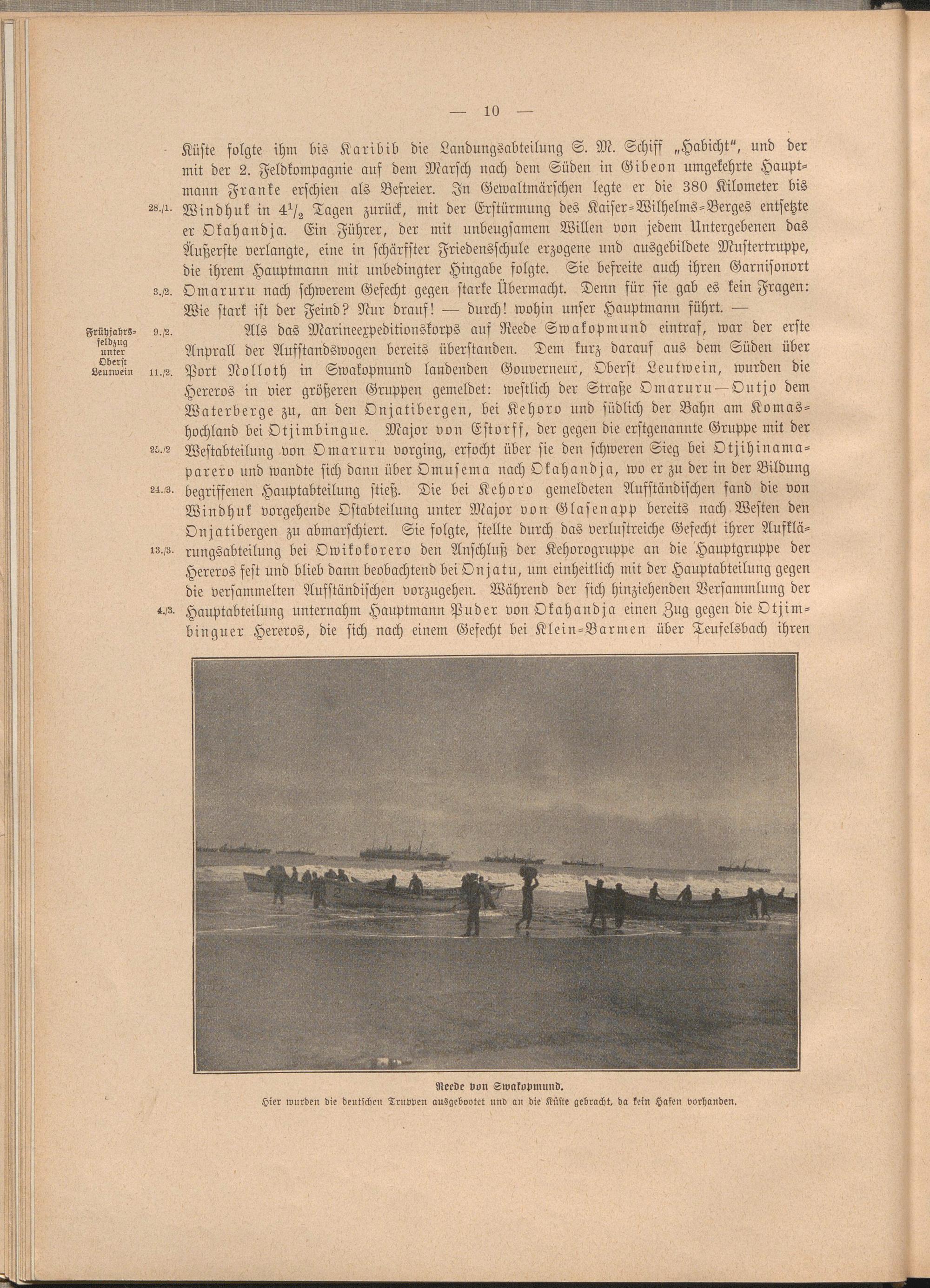 Küste folgte ihm bis Karibib die Landungsabteilung S. M. Schiff „Habicht", und der mit der 2. Feldkompagnie auf dem Marsch nach dem Süden in Gibeon umgekehrte Hauptmann Franke erschien als Befreier. In Gewaltmärschen legte er die 380 Kilometer bis 22 ^' Windhuk in 41/2 Tagen zurück, mit der Erstürmung des Kaiser-Wilhelms-Berges entsetzte er Okahandja. Ein Führer, der mit unbeugsamem Willen von jedem Untergebenen das Äußerste verlangte, eine in schärfster Friedensschule erzogene und ausgebildete Mustertruppe, die ihrem Hauptmann mit unbedingter Hingabe folgte. Sie befreite auch ihren Garnisonort g./s. Omarurn nach schwerem Gefecht gegen starke Übermacht. Denn für sie gab es kein Fragen:
