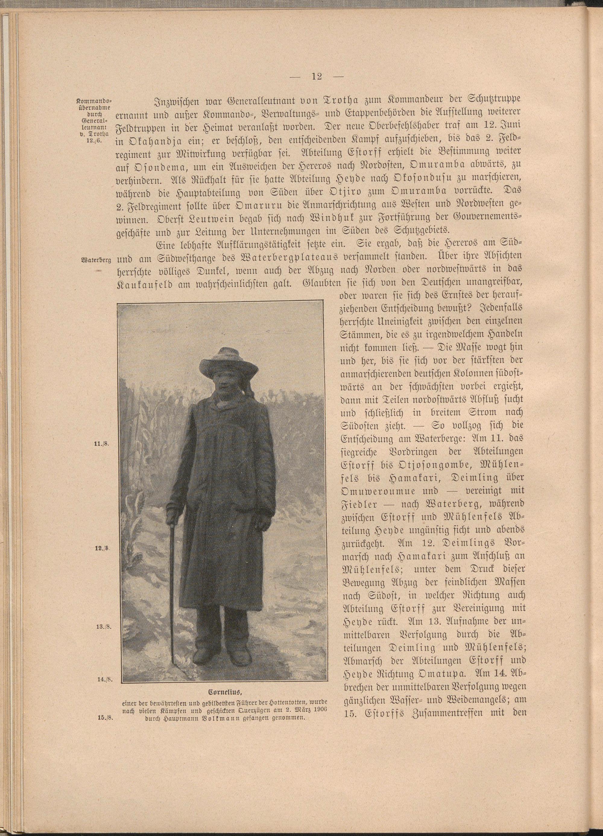 oder waren sie sich des Ernstes der herausziehenden Entscheidung bewußt? Jedenfalls herrschte Uneinigkeit zwischen den einzelnen Stämmen, die es zu irgendwelchem Handeln nicht kommen ließ. — Die Masse wogt hin und her, bis sie sich vor der stärksten der anmarschierenden deutschen Kolonnen südost- wärts an der schwächsten vorbei ergießt, dann mit Teilen nordostwärts Abfluß sucht und schließlich in breitem Strom nach Südosten zieht. — So vollzog sich die Entscheidung am Waterberge: Am 11. das siegreiche Vordringen der Abteilungen Estorff bis Otjosongombe, Mühlen- fels bis Hamakari, Deimling über Omuweroumue und — vereinigt mit Fiedler — nach Waterberg, während zwischen Estorff und Mühlenfels Abteilung Heyde ungünstig ficht und abends zurückgeht. Am 12. Deimlings Vormarsch nach Hamakari zum Anschluß an Mühlenfels; unter dem Druck dieser Bewegung Abzug der feindlichen Massen nach Südost, in welcher Richtung auch Abteilung Estorff zur Vereinigung mit Heyde rückt. Am 13. Aufnahme der unmittelbaren Verfolgung durch die Abteilungen Deimling und Mühlenfels; Abmarsch der Abteilungen Estorff und Heyde Richtung Omatupa. Am 14. Ab- CEMus brechen der unmittelbaren Verfolgung wegen
