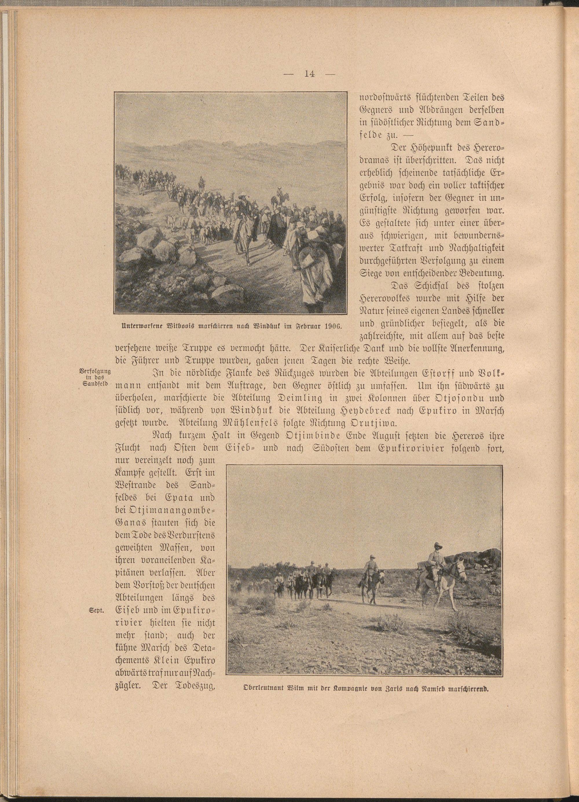 Nach kurzem Halt in Gegend Otjimbinde Ende August setzten die Hereros ihre Flucht nach Osten dem Eiseb- und nach Südosten dem Epukirorivier folgend fort, nur vereinzelt noch zum Kampfe gestellt. Erst im Westrande des Sandfeldes bei Epata und bei Otjimanangombe- Ganas stauten sich die dem Tode des Verdurstens geweihten Massen, von ihren voraneilenden Kapitänen verlassen. Aber dem Vorstoß der deutschen Abteilungen längs des S-pt. Eiseb und imEpukiro- rivier hielten sie nicht mehr stand; auch der kühne Marsch des Deta- chements Klein Epukiro abwärts traf nur aufNach- zügler. Der Todeszug,