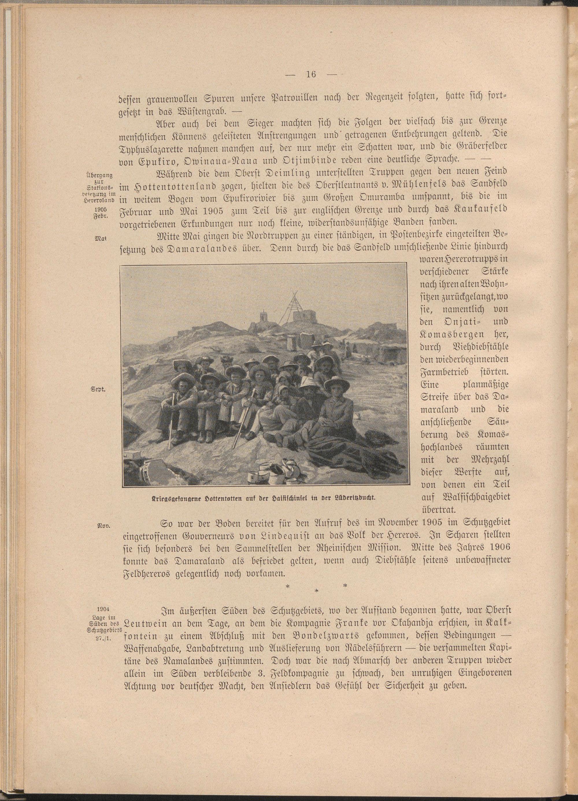 eingetroffenen Gouverneurs von Liudequist an das Volk der Hereros. In Scharen stellten sie sich besonders bei den Sammelstellen der Rheinischen Mission. Mitte des Jahres 1906 konnte das Damaraland als befriedet gelten, wenn auch Diebstähle seitens unbewaffneter Feldhereros gelegentlich noch vorkamen.