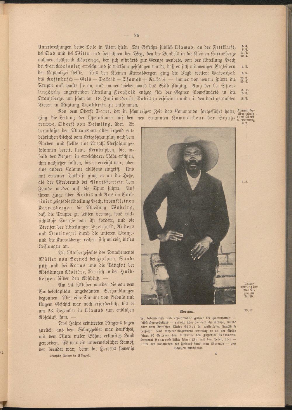 der bedeutendste und erfolgreichste Führer der Hottentotten — selbst Hererobastard — entwich über die englische Grenze, wurde aber vom britischen Major Elliot im wasserlosen Landstrich verfolgt. Nach tapferer Gegenwehr unterlag er an der Spitze seiner 60 Getreuen dem Anstürme des Inspektor Manders. Korporal Henwood büßte seinen Mut mit dein Leben, aber — unter den Gefallenen des Feindes fand man Morenga — von Schüssen durchbohrt.