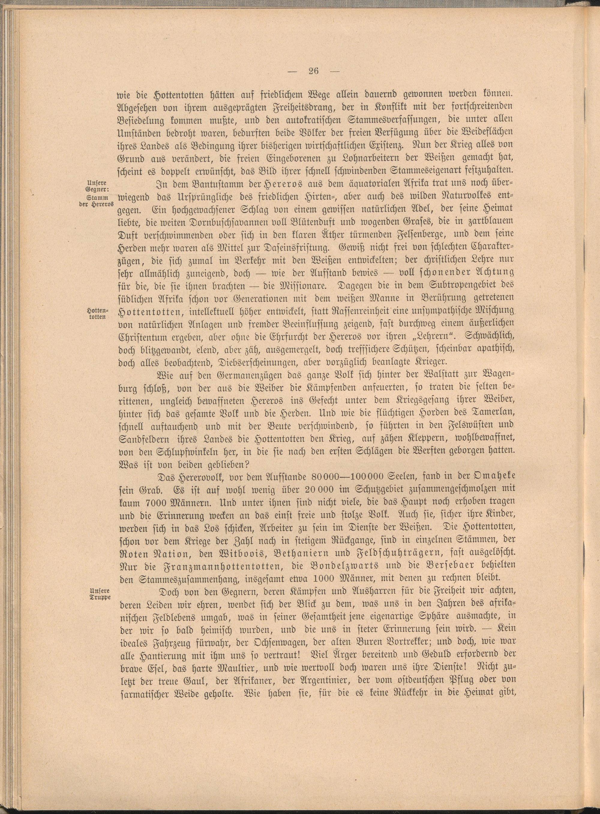 Wie die Hottentotten hätten auf friedlichem Wege allein dauernd gewonnen werden können. Abgesehen von ihrem ausgeprägten Freiheitsdrang, der in Konflikt mit der fortschreitenden Besiedelung kommen mußte, und den autokratischen Stammesverfafsungen, die unter allen Umständen bedroht waren, bedurften beide Völker der freien Verfügung über die Weideflächen ihres Landes als Bedingung ihrer bisherigen wirtschaftlichen Existenz. Nun der Krieg alles von Grund aus verändert, die freien Eingeborenen zu Lohnarbeitern der Weißen gemacht hat, scheint es doppelt erwünscht, das Bild ihrer schnell schwindenden Stammeseigenart festzuhalten.