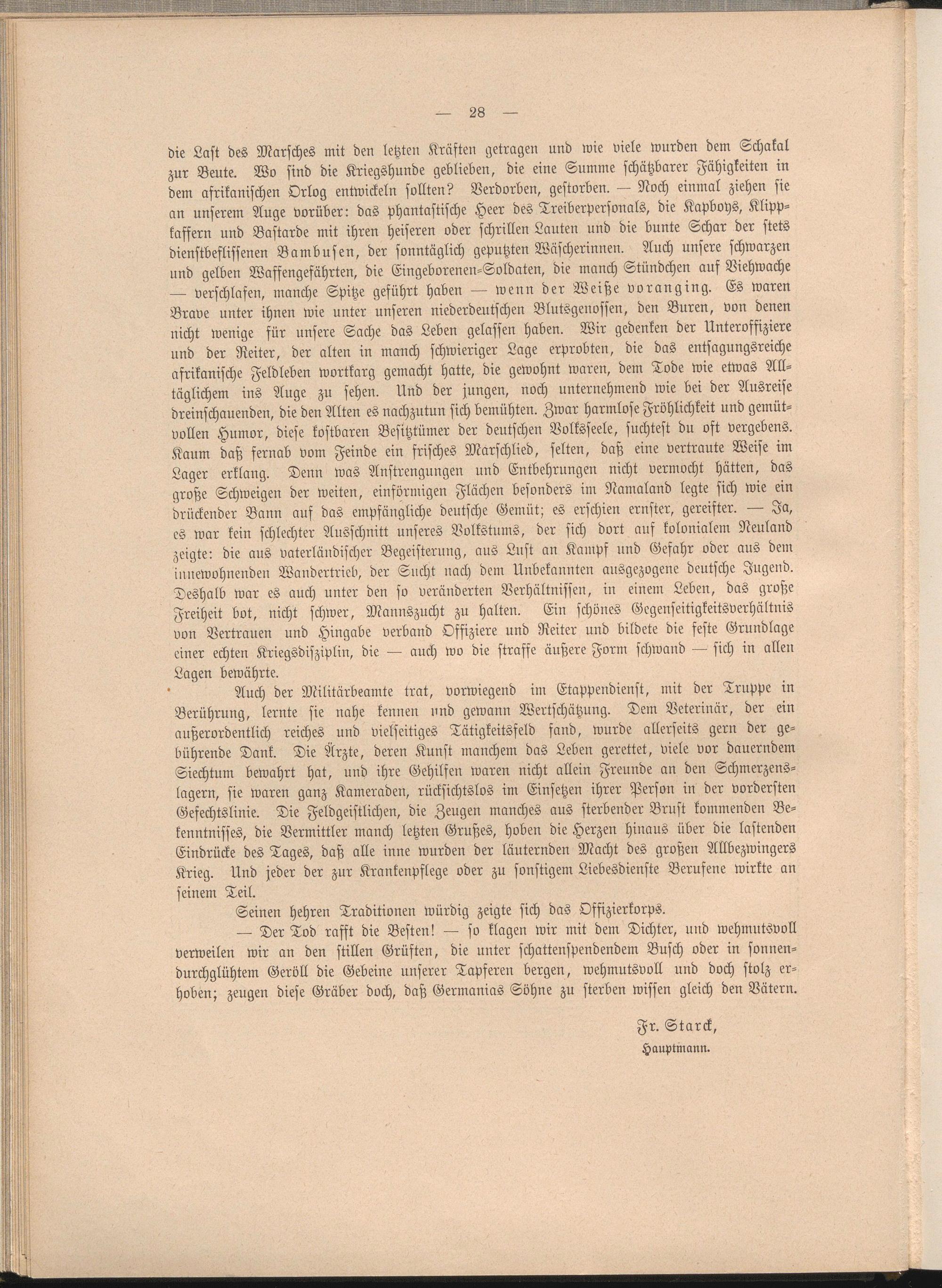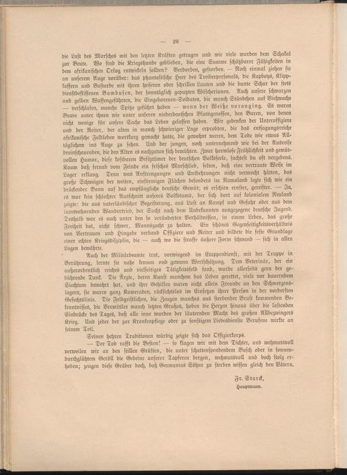 — Der Tod rafft die Besten! — so klagen wir mit dem Dichter, und wehmutsvoll verweilen wir an den stillen Grüften, die unter schattenspendendem Busch oder in sonnen- durchglühtem Geröll die Gebeine unserer Tapferen bergen, wehmutsvoll und doch stolz erhoben; zeugen diese Gräber doch, daß Germanias Söhne zu sterben wissen gleich den Vätern.