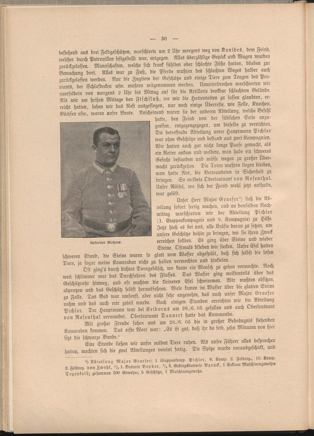 Oft ging's durch dichtes Dorngebüsch, wo kaum ein Mensch zu gehen vermochte. Noch weit schlimmer war das Durchführen des Flusses. Das Wasser ging meistenteils über das Geschützrohr hinweg, und oft mußten die kleineren Esel schwimmen. Wir mußten absitzen, abprotzen und das Geschütz selbst herausfahren. Viele kamen im Wasser über die glatten Steine zu Falle. Das Bad war umsonst, aber nicht sehr angenehm, das auch unser Major Graeser nahm und das auch mir zuteil wurde. Nach einigen Stunden erreichten wir die Abteilung Pichler. Der Hauptmann war bei Keidorus am L6./6. 05 gefallen und auch Oberleutnant von Rosenthal verwundet. Oberleutnant Dannert hatte das Kommando.