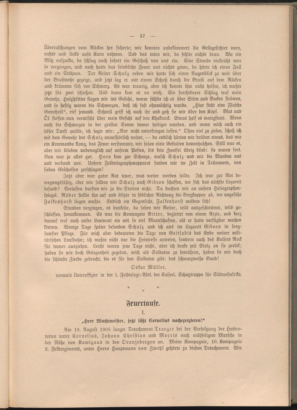 Stunden vergingen, es dunkelte, da sahen wir Reiter, teils ausgeschwärmt, teils geschlossen, herankommen. Es war die Kompagnie Ritter, begleitet von einem Arzte, und kurz darauf traf auch unser Leutnant ein mit so viel Mannschaften, als er hatte verfügbar machen können. Wenige Tage später befanden Schulz und ich uns im Lazarett Gibeon in sorgsamster Pflege. Für mich aber bedeuteten die Tage von Geitsabis das Ende meiner militärischen Laufbahn; ich mußte nicht nur die Heimreise antreten, sondern auch des Kaisers Rock für immer ausziehen. Leicht waren jene Tage nicht, aber ich denke mit Stolz an sie zurück; haben sie mir doch Gelegenheit gegeben, mich als Soldaten zu bewähren, haben sie mir doch die schönste Zierde gebracht, die es für den Soldaten gibt: das schwarzweiße Band!