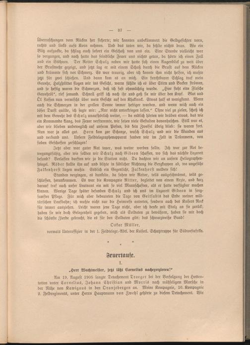 Am 19. August 1905 langte Detachement Traeger bei der Verfolgung der Hottentotten unter Cornelius, Johann Christian und Morris nach mühseligem Marsche in der Nähe von Kawigaus in den Oranjebergen an. Meine Kompagnie, 10. Kompagnie 2. Feldregiments, unter Herrn Hauptmann von Zwehl gehörte zu diesem Detachement. Wir