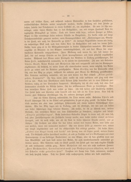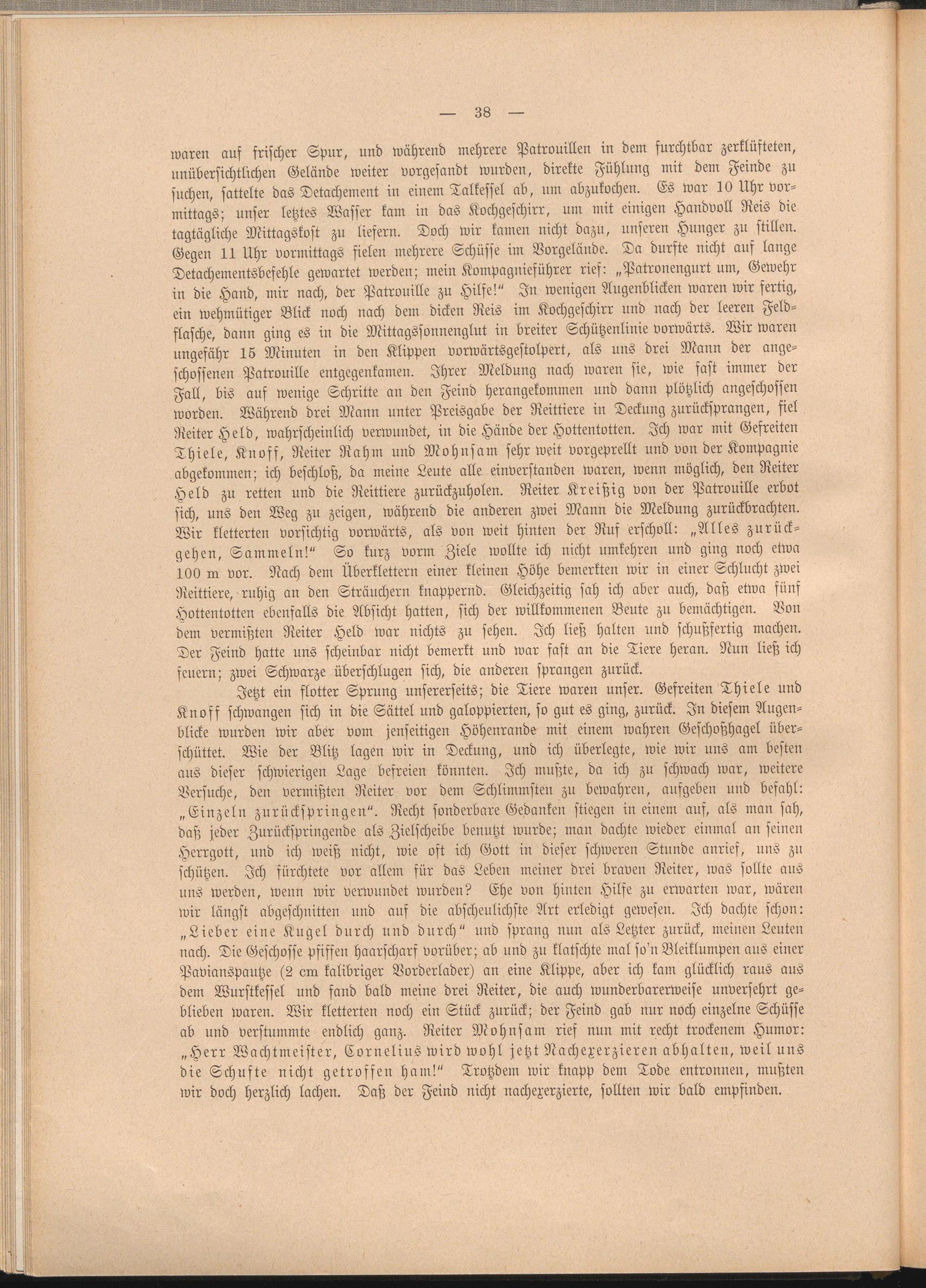 Jetzt ein flotter Sprung unsererseits; die Tiere waren unser. Gefreiten Thiele und Knoff schwangen sich in die Sättel und galoppierten, so gut es ging, zurück. In diesem Augenblicke wurden wir aber vom jenseitigen Höhenrande mit einem wahren Geschoßhagel überschüttet. Wie der Blitz lagen wir in Deckung, und ich überlegte, wie wir uns am besten aus dieser schwierigen Lage befreien könnten. Ich mußte, da ich zu schwach war, weitere Versuche, den vermißten Reiter vor dem Schlimmsten zu bewahren, aufgeben und befahl: „Einzeln zurückspringen". Recht sonderbare Gedanken stiegen in einem auf, als man sah, daß jeder Zurückspringende als Zielscheibe benutzt wurde; man dachte wieder einmal au seinen Herrgott, und ich weiß nicht, wie oft ich Gott in dieser schweren Stunde anrief, uns zu schützen. Ich fürchtete vor allem für das Leben meiner drei braven Reiter, was sollte aus uns werden, wenn wir verwundet wurden? Ehe von hinten Hilfe zu erwarten war, wären wir längst abgeschnitten und auf die abscheulichste Art erledigt gewesen. Ich dachte schon: „Lieber eine Kugel durch und durch" und sprang nun als Letzter zurück, meinen Leuten nach. Die Geschosse pfiffen haarscharf vorüber; ab und zu klatschte mal so'n Bleiklumpen aus einer Pavianspautze (2 am kalibriger Vorderlader) an eine Klippe, aber ich kam glücklich raus aus dem Wurstkessel und fand bald meine drei Reiter, die auch wunderbarerweise unversehrt geblieben waren. Wir kletterten noch ein Stück zurück; der Feind gab nur noch einzelne Schüsse ab und verstummte endlich ganz. Reiter Mohnsam rief nun mit recht trockenem Humor: „Herr Wachtmeister, Cornelius wird wohl jetzt Nachexerzieren abhalten, weil uns die Schufte nicht getroffen Hain!" Trotzdem wir knapp dem Tode entronnen, mußten wir doch herzlich lachen. Daß der Feind nicht nachexerzierte, sollten wir bald empfinden.