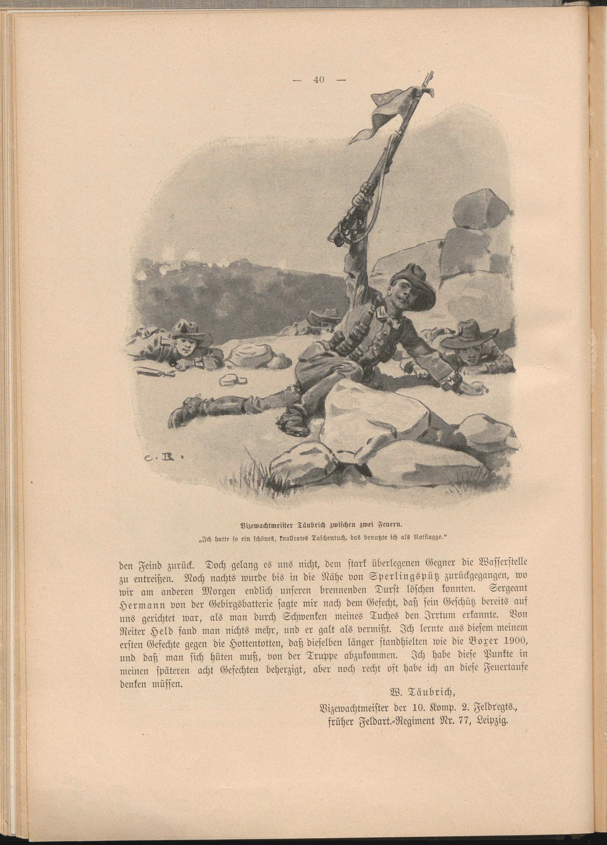 den Feind zurück. Doch gelang eS uns nicht, dem stark überlegenen Gegner die Wasserstelle zu entreißen. Noch nachts wurde bis in die Nähe von Sperlingspütz zurückgegangen, wo wir am anderen Morgen endlich unseren brennenden Durst löschen konnten. Sergeant Hermann von der Gebirgsbatterie sagte mir nach dem Gefecht, daß sein Geschütz bereits auf uns gerichtet war, als man durch Schwenken meines Tuches den Irrtum erkannte. Bon Reiter Held fand man nichts mehr, und er galt als vermißt. Ich lernte aus diesem meinem ersten Gefechte gegen die Hottentotten, daß dieselben länger standhielten wie die Boxer 1900, und daß man sich hüten muß, von der Truppe abzukommen. Ich habe diese Punkte in meinen späteren acht Gefechten beherzigt, aber noch recht oft habe ich an diese Feuertaufe denken müssen.