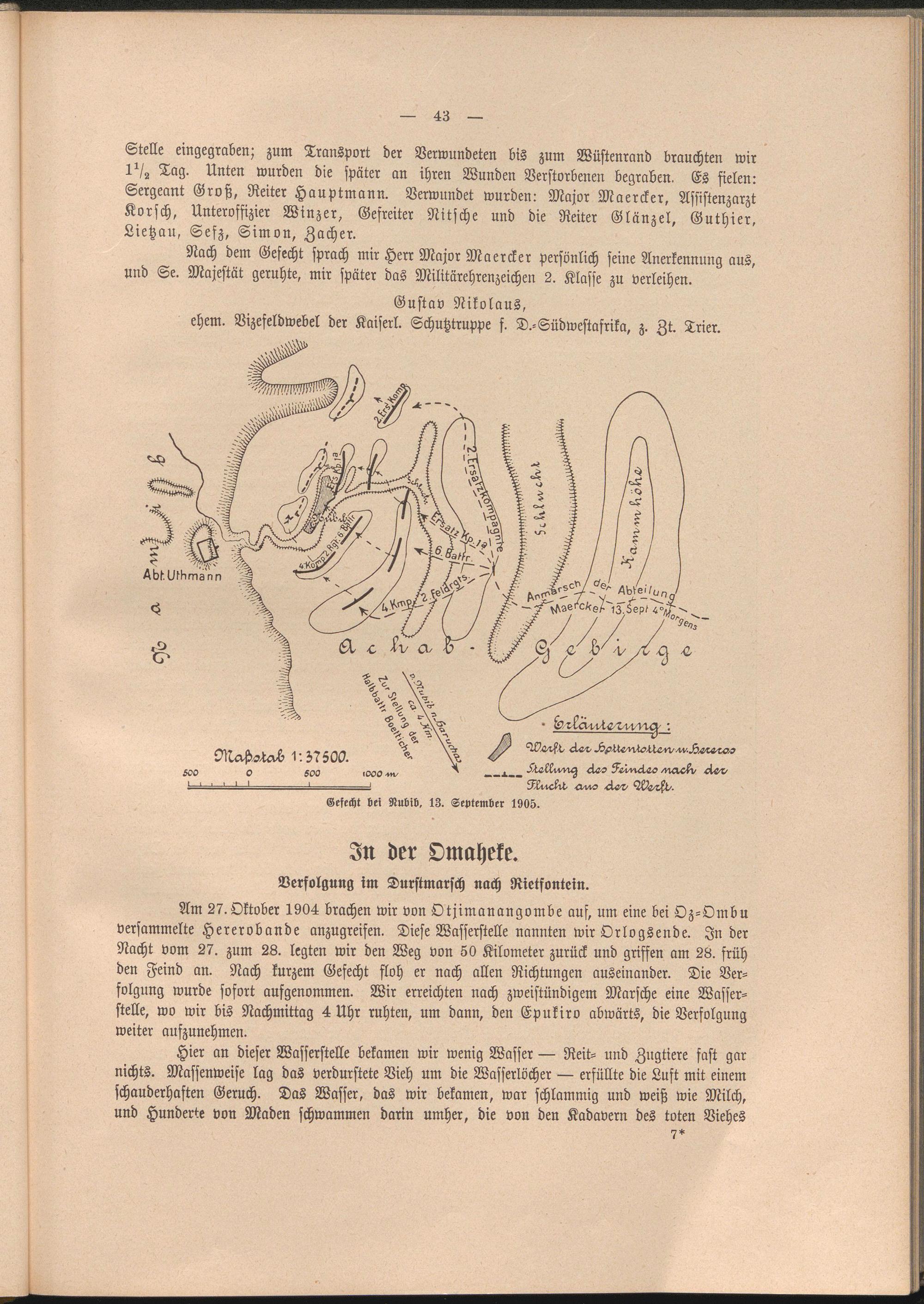 Am 27.Oktober 1904 brachen wir von Otjimanangombe aus, um eine bei Oz-Ombu versammelte Herero bände anzugreifen. Diese Wasserstelle nannten wir Or log sende. Inder Nacht vom 27. zum 28. legten wir den Weg von 50 Kilometer zurück und griffen am 28. früh den Feind an. Nach kurzem Gefecht floh er nach allen Richtungen auseinander. Die Verfolgung wurde sofort aufgenommen. Wir erreichten nach zweistündigem Marsche eine Wasserstelle, wo wir bis Nachmittag 4 Uhr ruhten, um dann, den Epukiro abwärts, die Verfolgung weiter aufzunehmen.