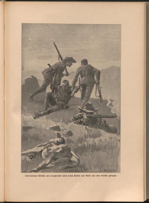 Oberleutnant Büttlin am Oranjerivier wird durch Knittel und Rolle aus dem Gefecht getragen,