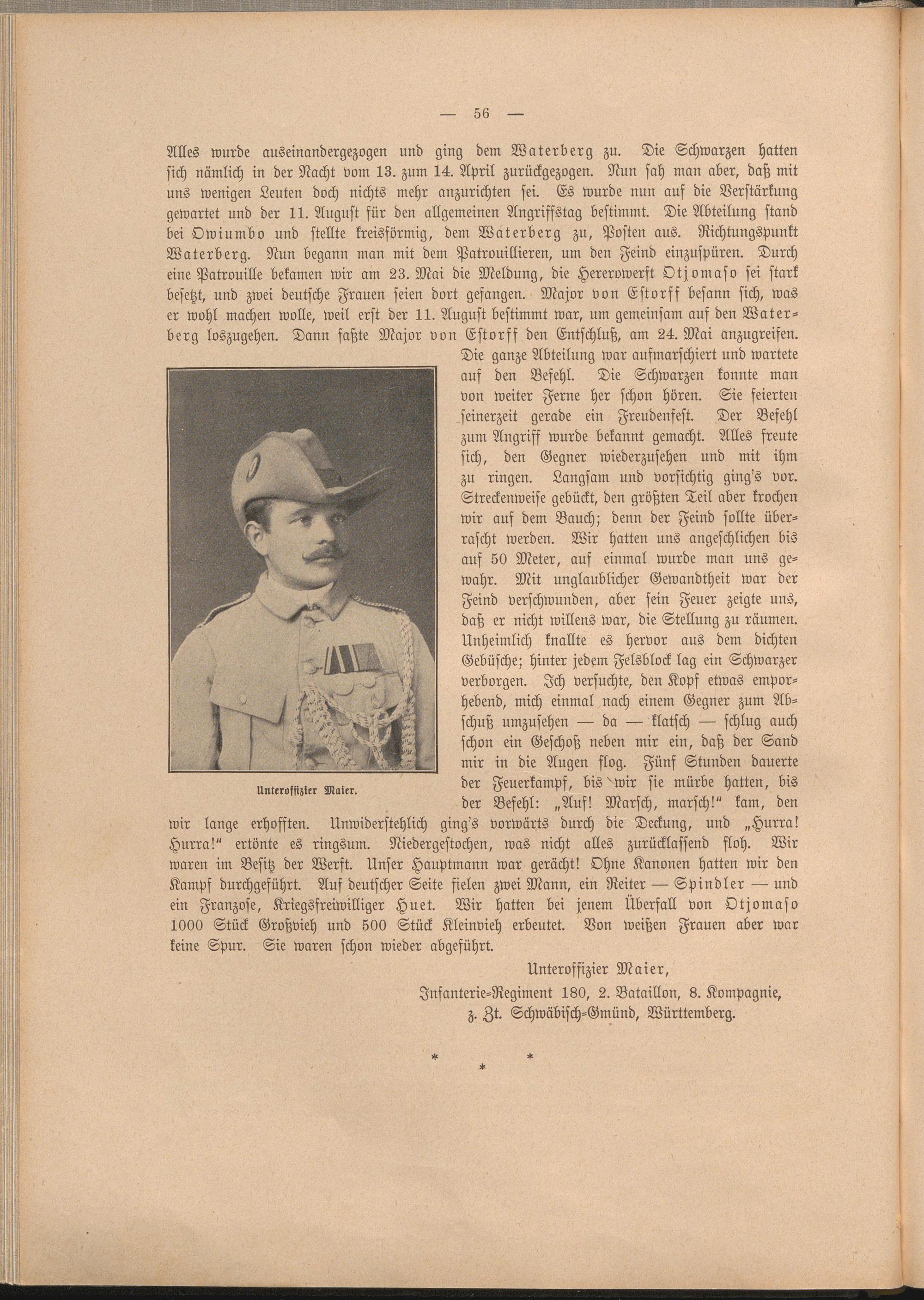 Alles wurde auseinandergezogen und ging dem Waterberg zu. Die Schwarzen hatten sich nämlich in der Nacht vom 13. zum 14. April zurückgezogen. Nun sah man aber, daß mit uns wenigen Leuten doch nichts mehr anzurichten sei. Es wurde nun auf die Verstärkung gewartet und der 11. August für den allgemeinen Angriffstag bestimmt. Die Abteilung stand bei Owiumbo und stellte kreisförmig, dem Waterberg zu, Posten aus. Richtungspunkt Waterberg. Nun begann man mit dem Patrouillieren, um den Feind einzuspüren. Durch eine Patrouille bekamen wir am 23. Mai die Meldung, die Hererowerft Otjomaso sei stark besetzt, und zwei deutsche Frauen seien dort gefangen. Major von Estorff besann sich, was er Wohl machen wolle, weil erst der 11. August bestimmt war, um gemeinsam auf den Waterberg loszugehen. Dann faßte Major von Estorff den Entschluß, am 24. Mai anzugreifen.