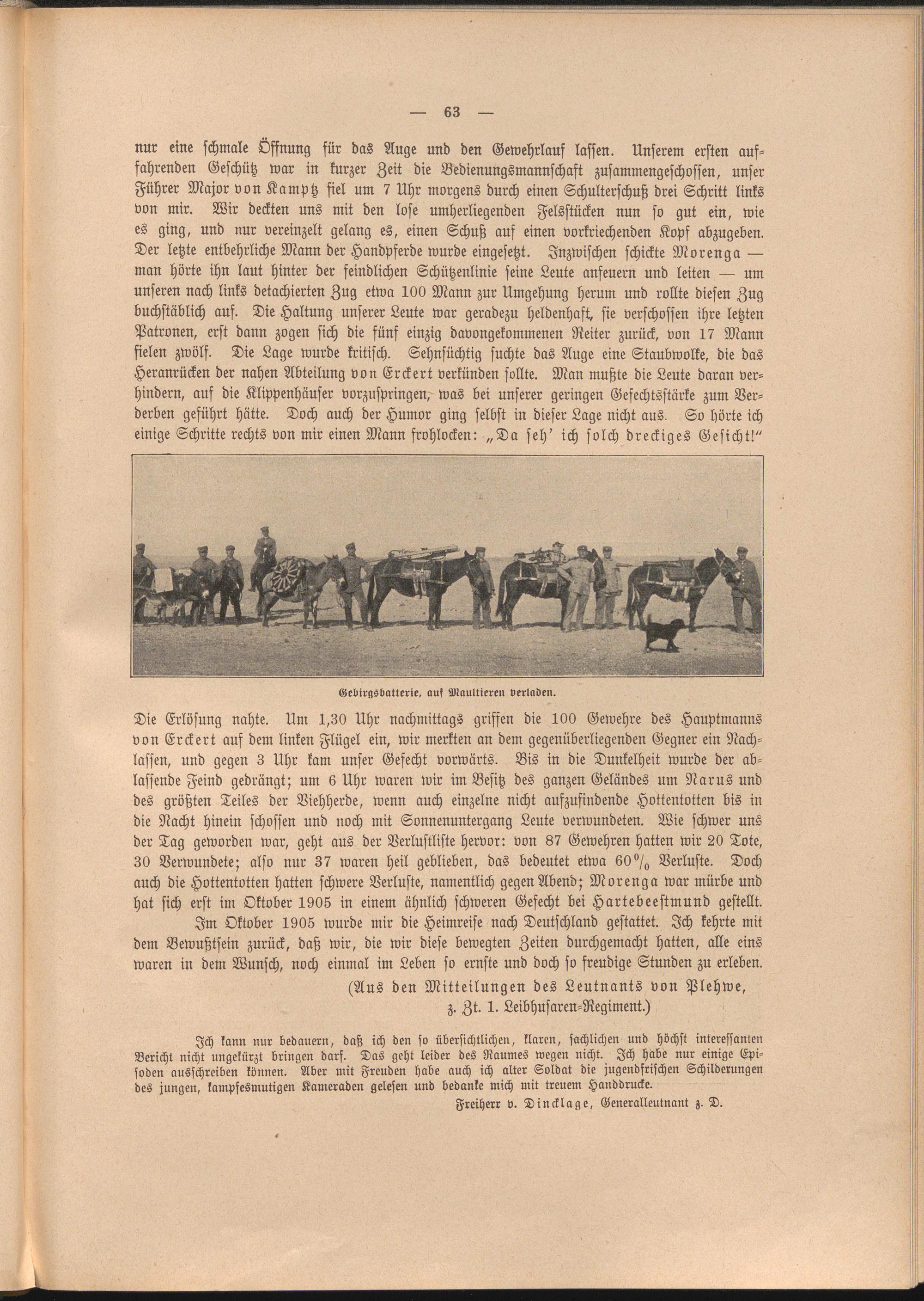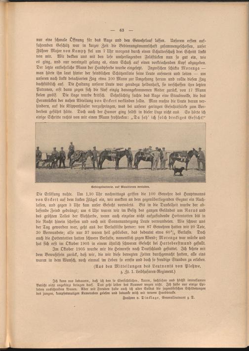 nur eine schmale Öffnung für das Auge und den Gewehrlauf lassen. Unserem ersten auffahrenden Geschütz war in kurzer Zeit die Bedienungsmannschaft zusammengeschossen, unser Führer Major von Kamptz fiel um 7 Uhr morgens durch einen Schulterschuß drei Schritt links von mir. Wir deckten uns mit den lose umherliegenden Felsstücken nun so gut ein, wie es ging, und nur vereinzelt gelang es, einen Schuß auf einen vorkriecheuden Kopf abzugeben. Der letzte entbehrliche Mann der Handpferde wurde eingesetzt. Inzwischen schickte Morenga — man hörte ihn laut hinter der feindlichen Schützenlinie seine Leute anfeuern und leiten — um unseren nach links detachierten Zug etwa 100 Mann zur Umgehung herum und rollte diesen Zug buchstäblich auf. Die Haltung unserer Leute war geradezu heldenhaft, sie verschossen ihre letzten Patronen, erst dann zogen sich die fünf einzig davongekommenen Reiter zurück, von 17 Mann fielen zwölf. Die Lage wurde kritisch. Sehnsüchtig suchte das Auge eine Staubwolke, die das Heranrücken der nahen Abteilung von Erckert verkünden sollte. Man mußte die Leute daran verhindern, auf die Klippenhäuser vorzuspringen, was bei unserer geringen Gefechtsstärke zum Verderben geführt hätte. Doch auch der Humor ging selbst in dieser Lage nicht aus. So hörte ich einige Schritte rechts von mir einen Mann frohlocken: „Da seh' ich solch dreckiges Gesicht!"