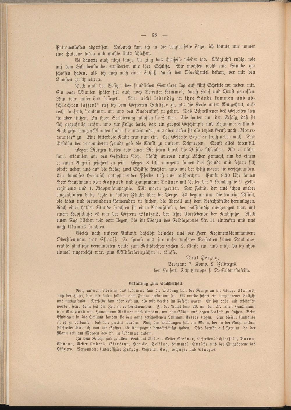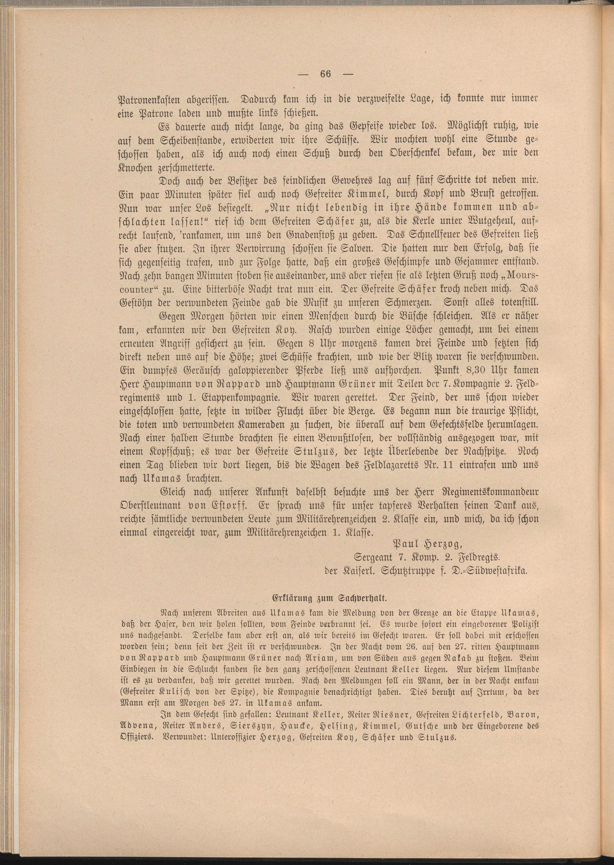 In dem Gefecht sind gefallen: Leutnant Keller, Reiter Riesner, Gefreiten Lichtcrfeld, Baron, Advena, Reiter Anders, Sierszyn, Haucke, Helsing, Kimmel, Gutfche und der Eingeborene des Offiziers. Verwundet: Unteroffizier Herzog, Gefreiten Koh, Schäfer und Stulzus.