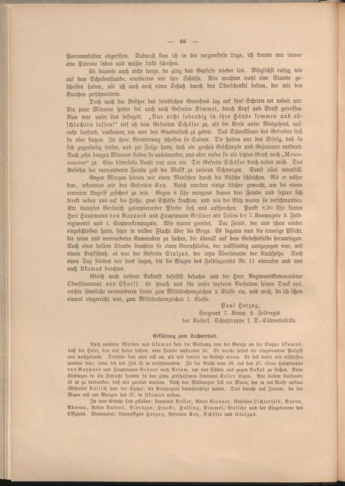 Nach unserem Abreiten aus Ukamas kam die Meldung von der Grenze an die Etappe Ukamas, daß der Hafer, den wir holen sollten, vom Feinde verbrannt sei. Es wurde sofort ein eingeborener Polizist uns nachgesandt. Derselbe kam aber erst an, als wir bereits im Gefecht waren. Er soll dabei mit erschossen worden sein; denn seit der Zeit ist er verschwunden. In der Nacht vom 26. aus den 27. ritten Hauptmann von Rappard und Hauptmann Grüner nach Ariam, um von Süden aus gegen Nakab zu stoßen. Beim Einbiegen in die Schlucht fanden sie den ganz zerschossenen Leutnant Keller liegen. Nur diesem Umstände ist es zu verdanken, daß wir gerettet wurden. Nach den Meldungen soll ein Mann, der in der Nacht entkam (Gefreiter Kulisch von der Spitze), die Kompagnie benachrichtigt haben. Dies beruht auf Irrtum, da der Mann erst am Morgen des 27. in Ukamas ankam.