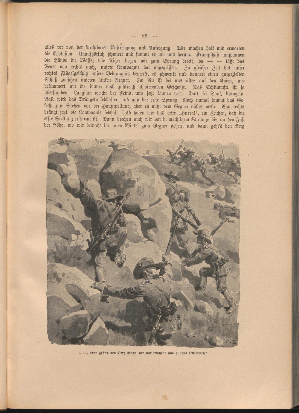 alles rot von der furchtbaren Anstrengung und Aufregung. Wir machen halt und erwarten die Explosion. Unaufhörlich schwirrt und summt es um uns herum. Krampfhaft umspannen die Hände die Waffe; wie Tiger liegen wir zum Sprung bereit, da — — läßt das Feuer von rechts nach, unsere Kompagnie hat angegriffen. Zu gleicher Zeit hat unser rechtes Flügelgeschütz unsere Bedrängnis bemerkt, es schwenkt und donnert einen gutgezielten Schuß zwischen unseren linken Gegner. Im Nu ist bei uns alles auf den Knien, unbekümmert um die immer noch zahlreich schwirrenden Geschosse. Das Schlimmste ist ja überstanden. Langsam weicht der Feind, und jetzt können wir, Gott sei Dank, drängeln. Bald wird das Drängeln lebhafter, und nun der erste Sprung. Noch einmal kommt das Gefecht zum Stehen vor der Hauptstellung, aber es nützt dem Gegner nichts mehr. Von rechts drängt jetzt die Kompagnie lebhaft, bald hören wir das erste „Hurra!", ein Zeichen, daß die erste Stellung erstürmt ist. Dann brechen auch wir vor in mächtigem Sprunge bis an den Fuß der Höhe, wo wir beinahe im toten Winkel zum Gegner stehen, und dann geht's den Berg